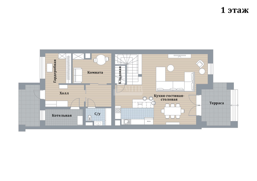 1 этаж: холл, гардербная, кладовая, кухня-гостиная-столовая, с/у, котельная, терраса;