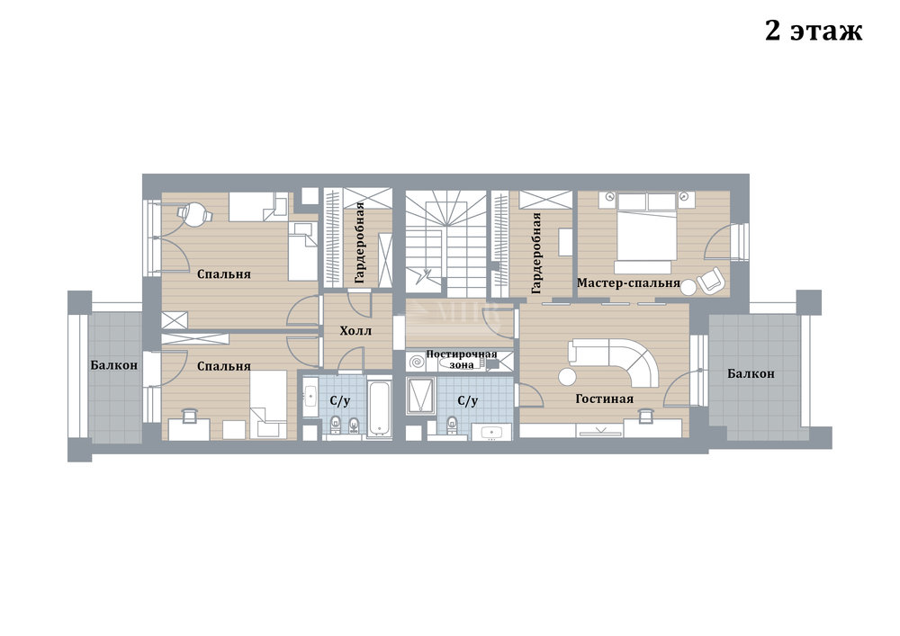 2 этаж: 2 спальни, 2 с/у, 2 гардеробных, гостиная, холл, 2 балкона;