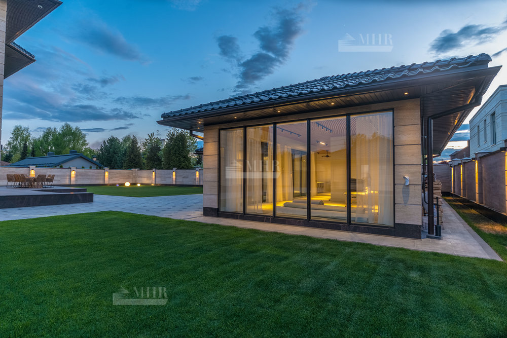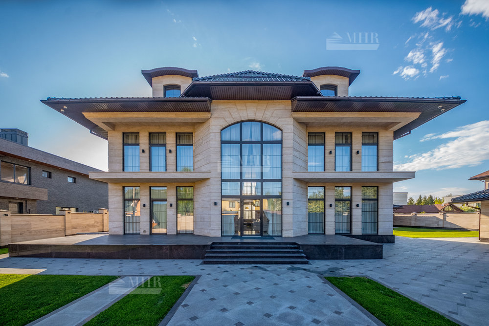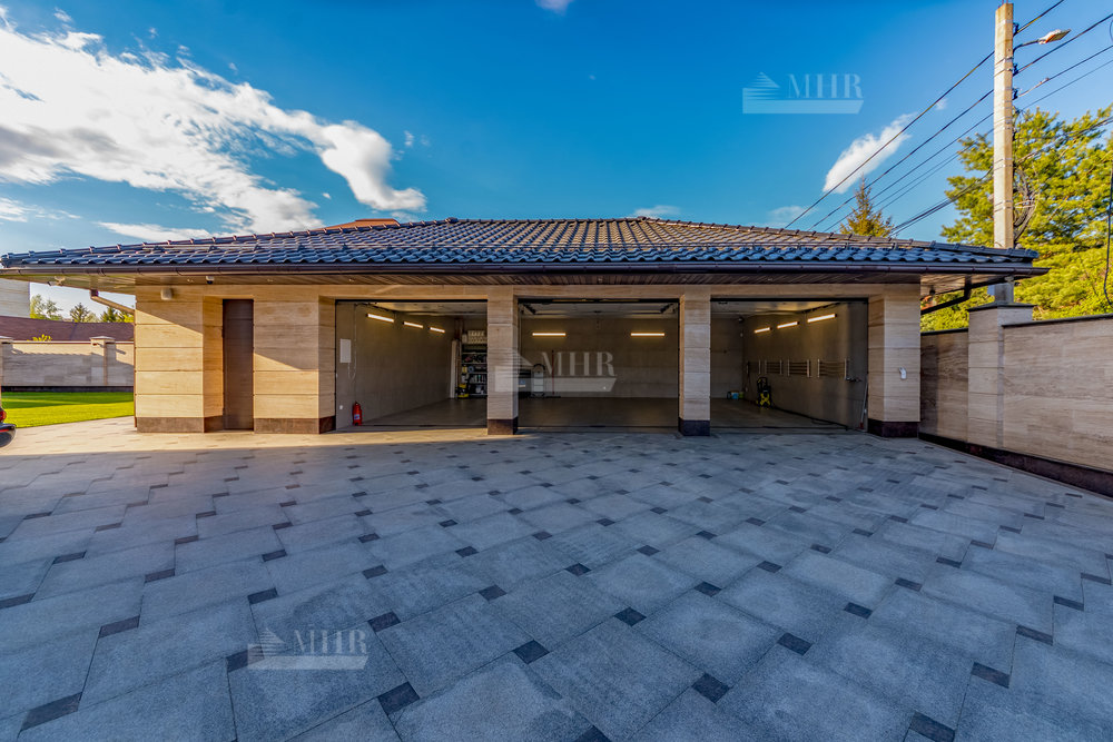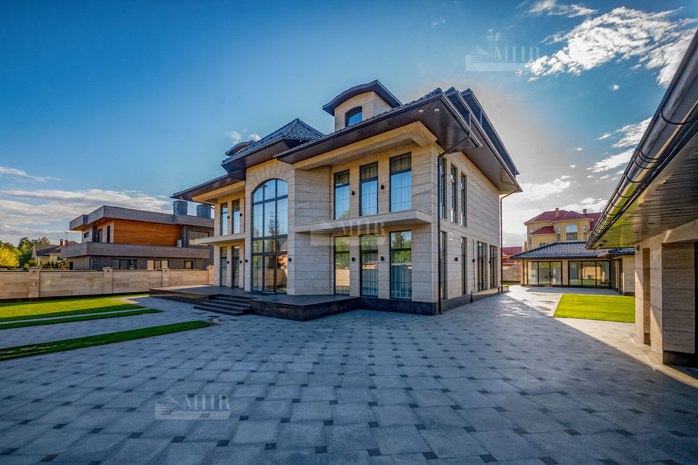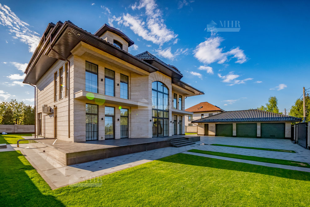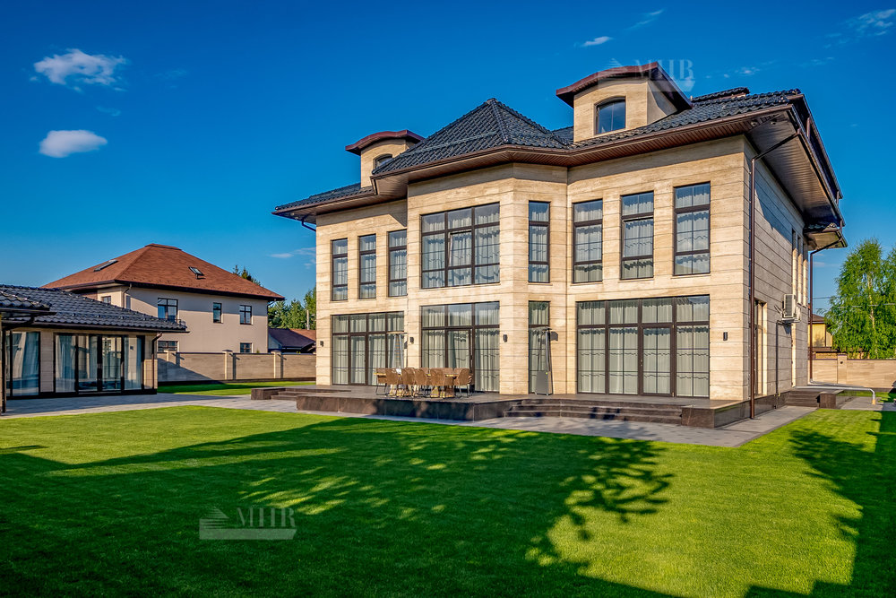В строительстве и отделке использованы натуральные материалы: дом облицован травертином, мощения и террасы выполнены из натурального гранита.