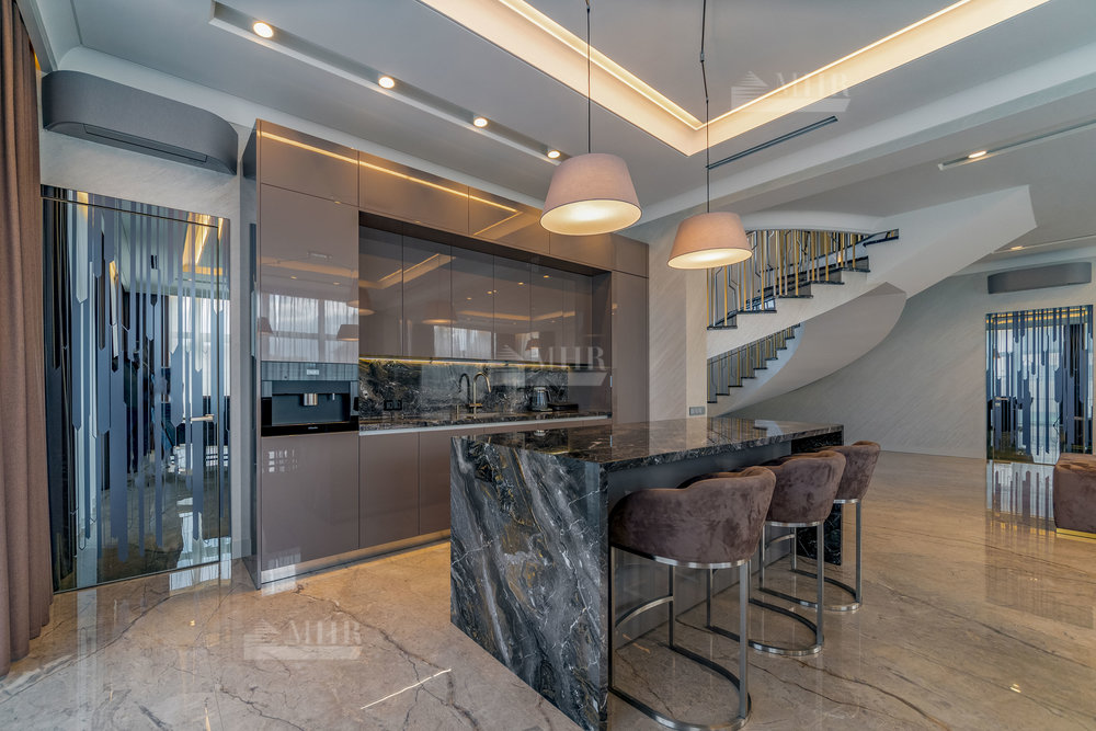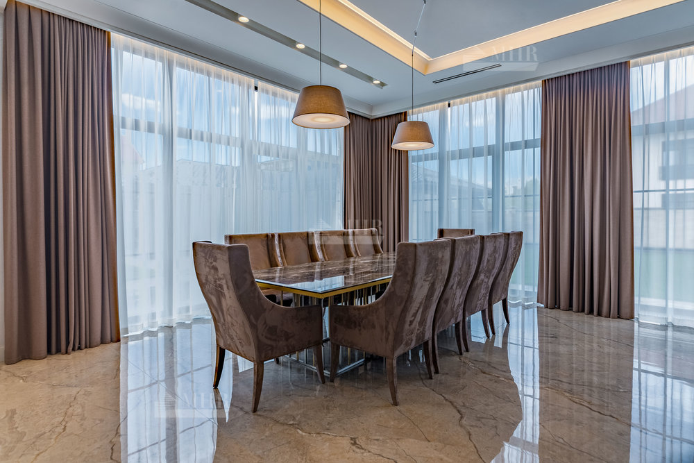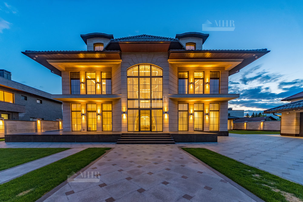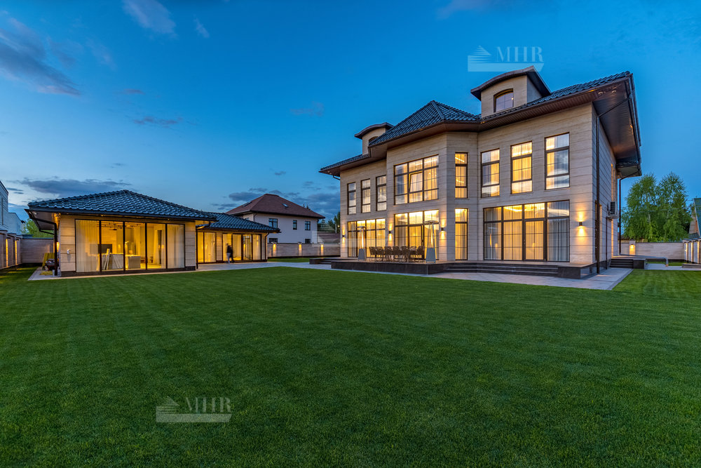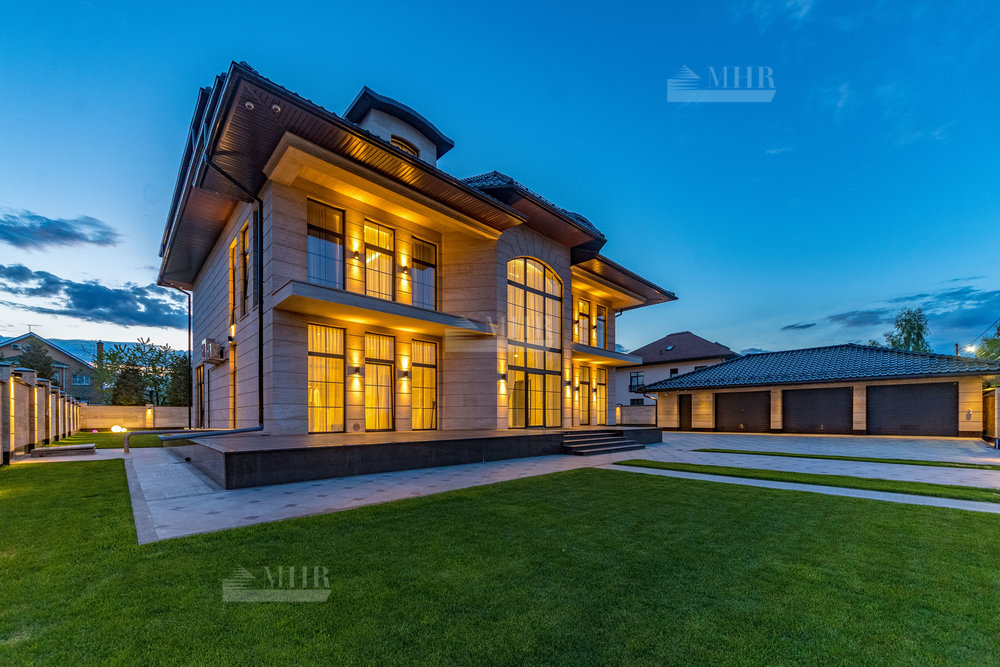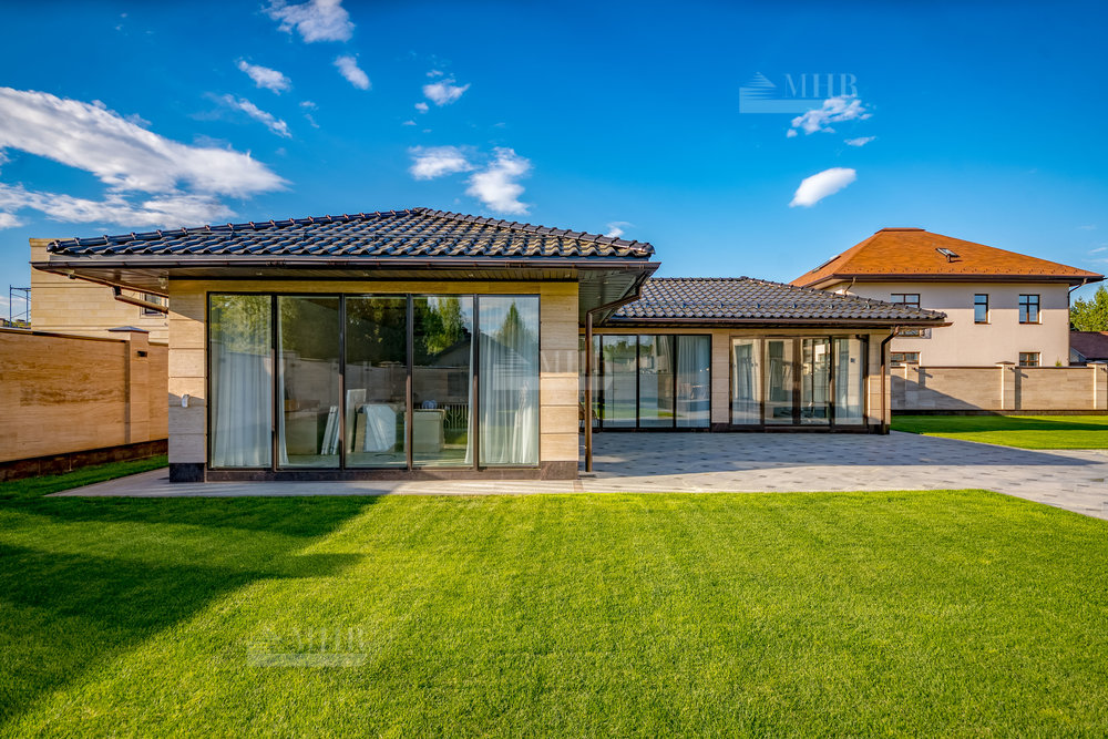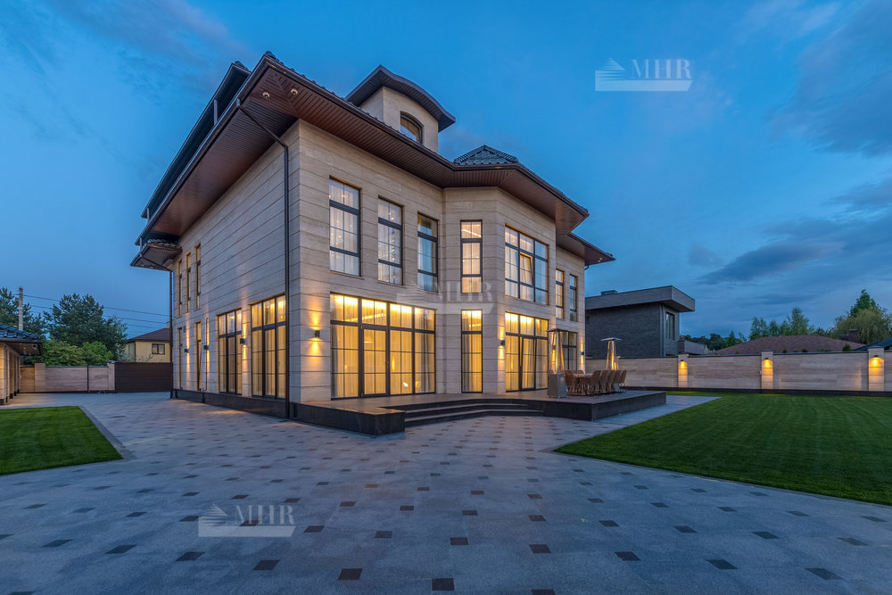 В строительстве и отделке использованы натуральные материалы: дом облицован травертином, мощения и террасы выполнены из натурального гранита.