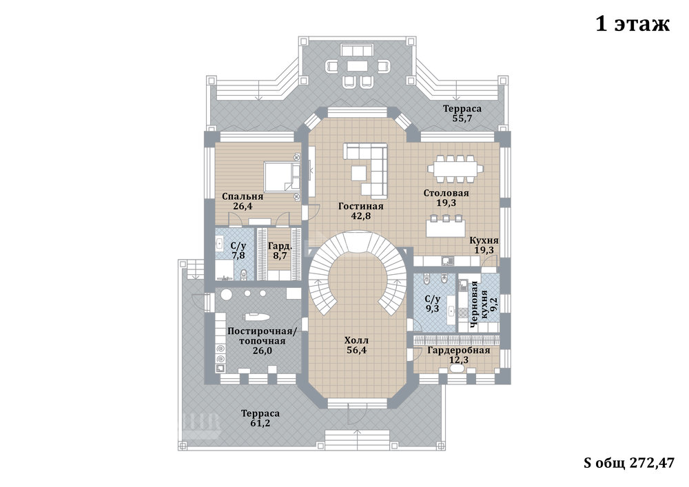 1 этаж: холл, гардеробная, санузел, гостиная, столовая с кухонной зоной, черновая кухня, спальня с санузлом и гардеробной, котельная;