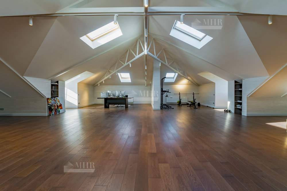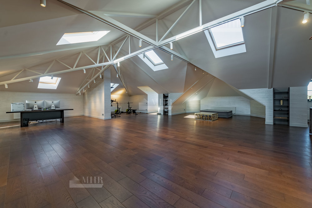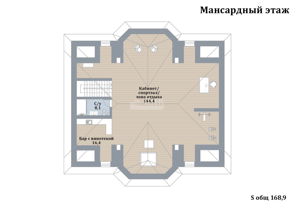 мансарда: комната отдыха, барная зона, кабинет, спортзал, санузел.