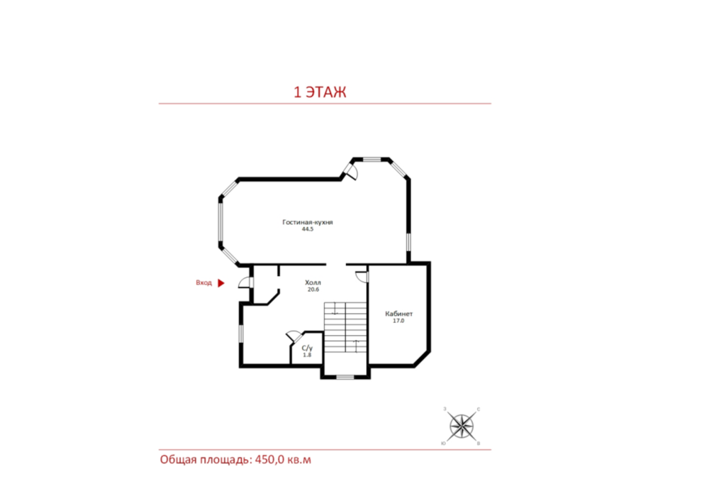 1 этаж: кухня-гостиная с камином и выходом на террасу, кабинет, гостевой с/у, гардероб;