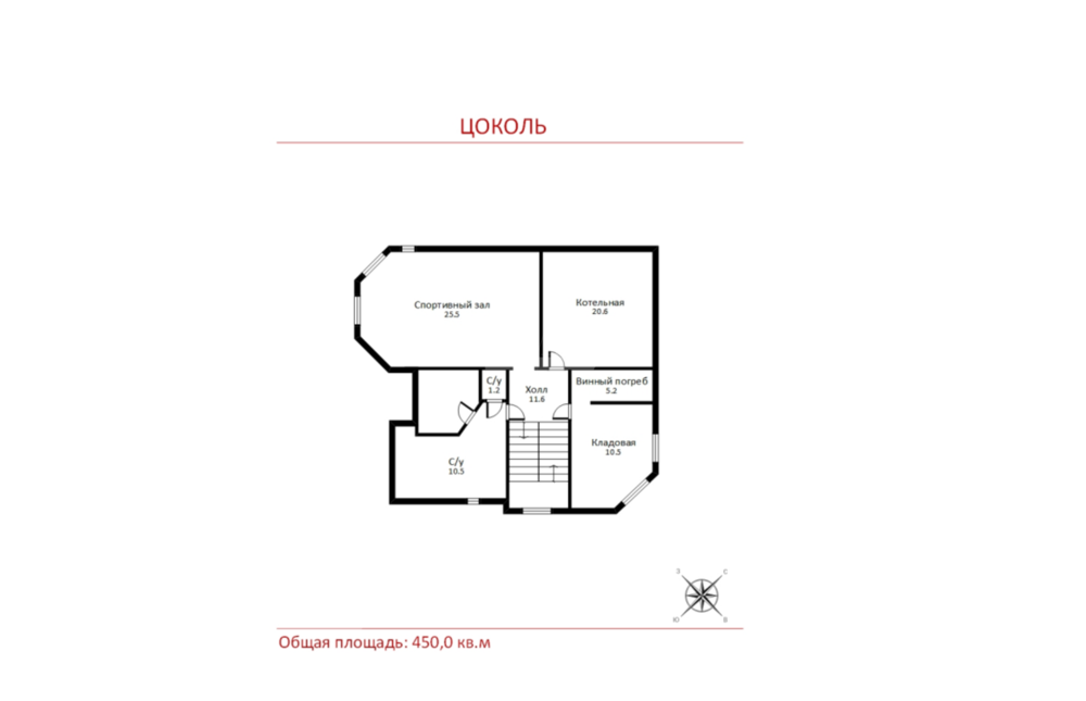 Цоколь: спортивный зал, спа: джакузи, сауна, с/у, душевая, кладовая, постирочная, котельная;
