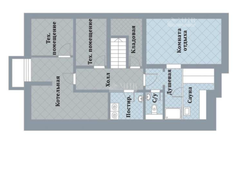 Цоколь: холл, 2 комнаты тех. помещения, кладовая, котельная, комната отдыха, постирочная, сауна, душевая, с/у.
