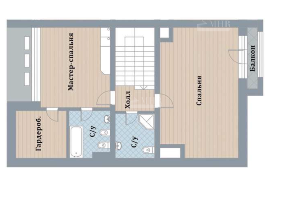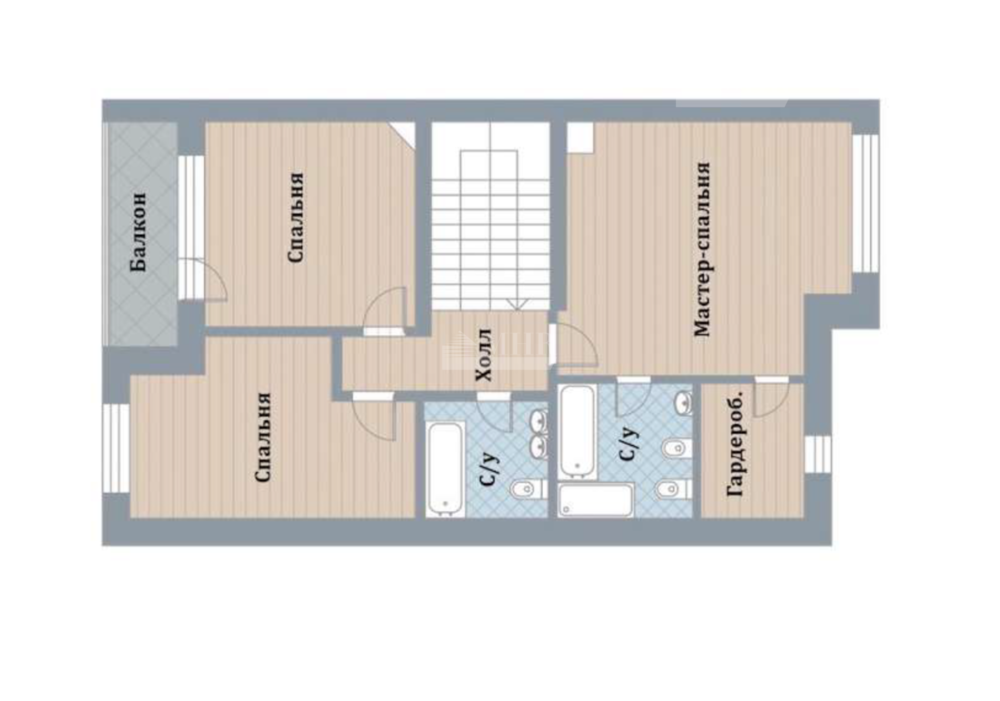 3-й этаж: холл, спальня с выходом на балкон и своим с/у, мастер-спальня со своим с/у и гардеробной.