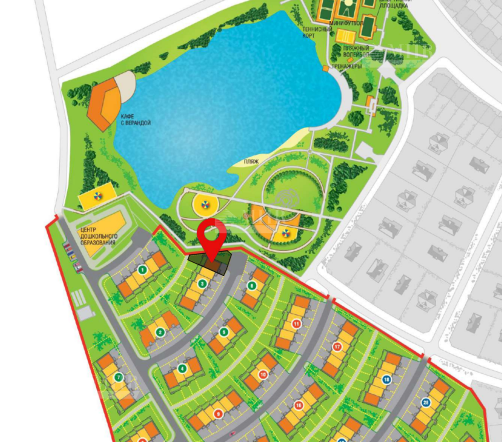 На территории коттеджного посёлка предусмотрены разнообразные объекты инфраструктуры, включая современные спортивные, детские площадки, пляжные зоны на берегу и ландшафтный парк.