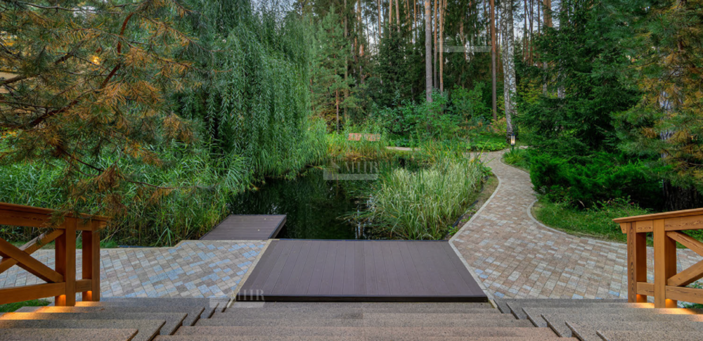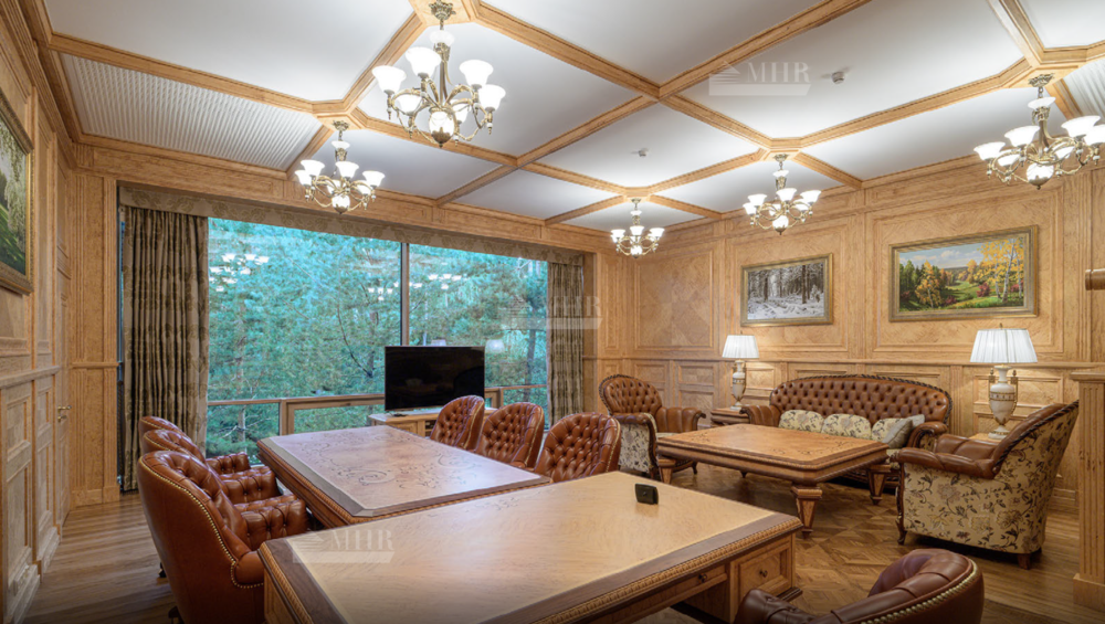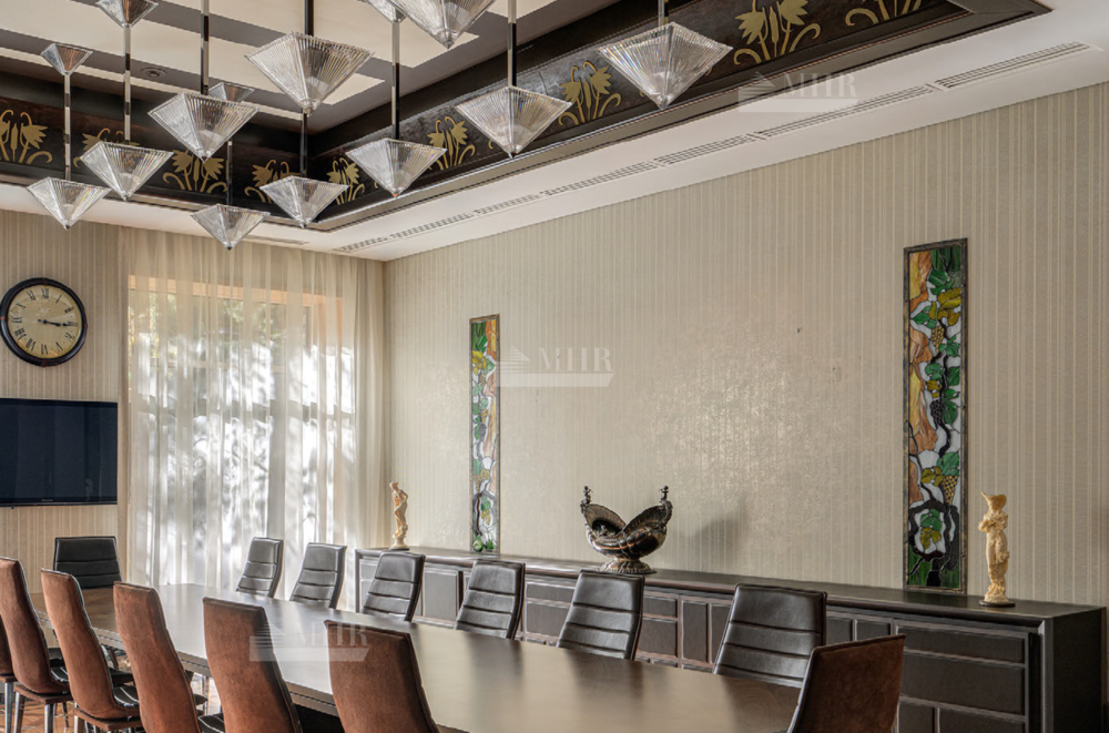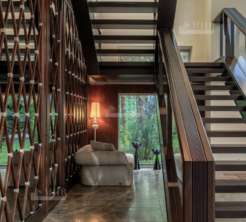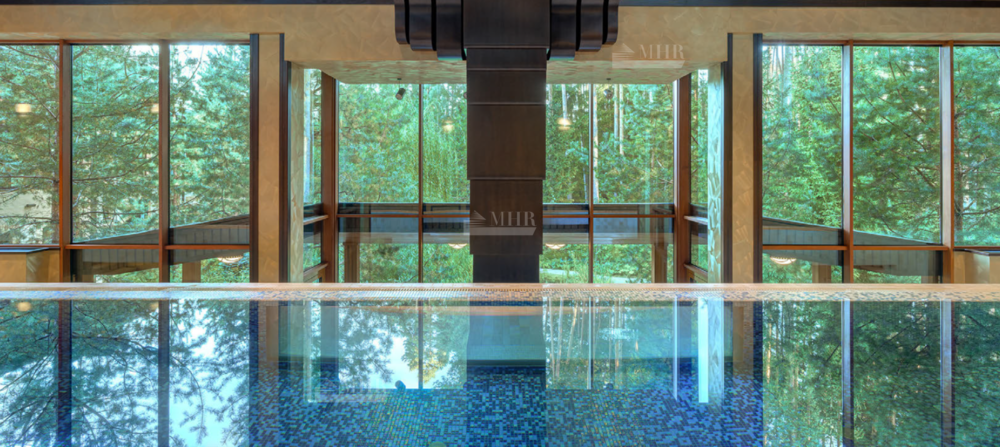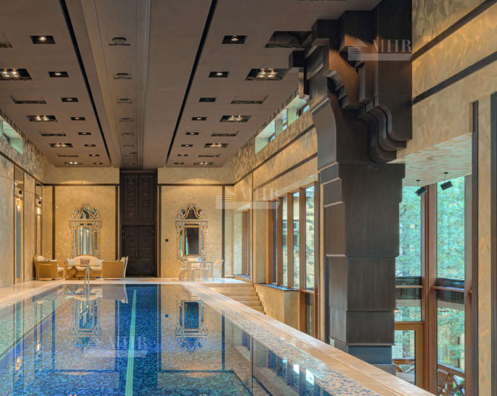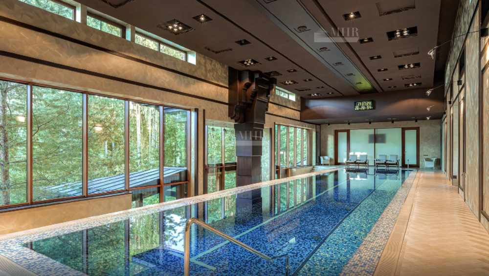 1-й этаж: прихожая, главный холл, 2 гардеробные, гостевой с/у, гостиная с камином, столовая, рабочая кухня с 3-мя кладовыми, лаунж у бассейна, терраса, гостевая спальня, комната отдыха с камином с с/у и отдельным входом с улицы, гараж на 6 м/м, гараж на 8 м/м, гараж для мелкой техники, тех. помещение бассейна, для персонала дом управляющего- кабинет, мониторная комната со входом с улицы, комната охраны со входом с улицы, с/у;
