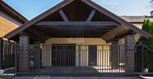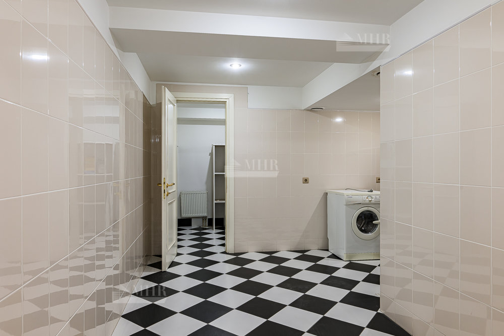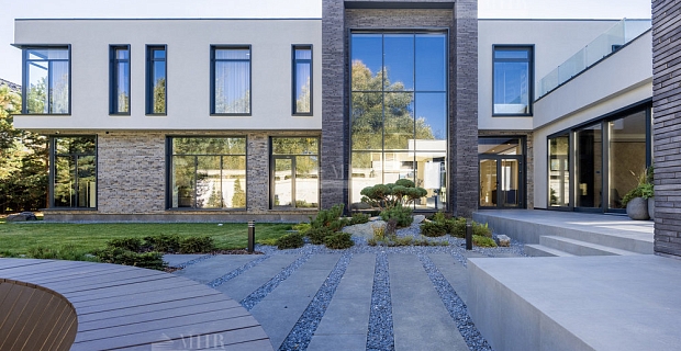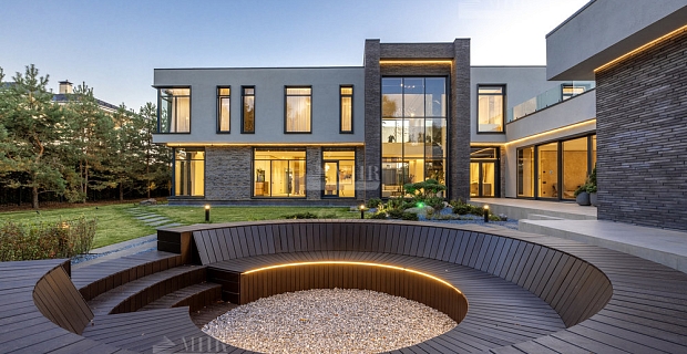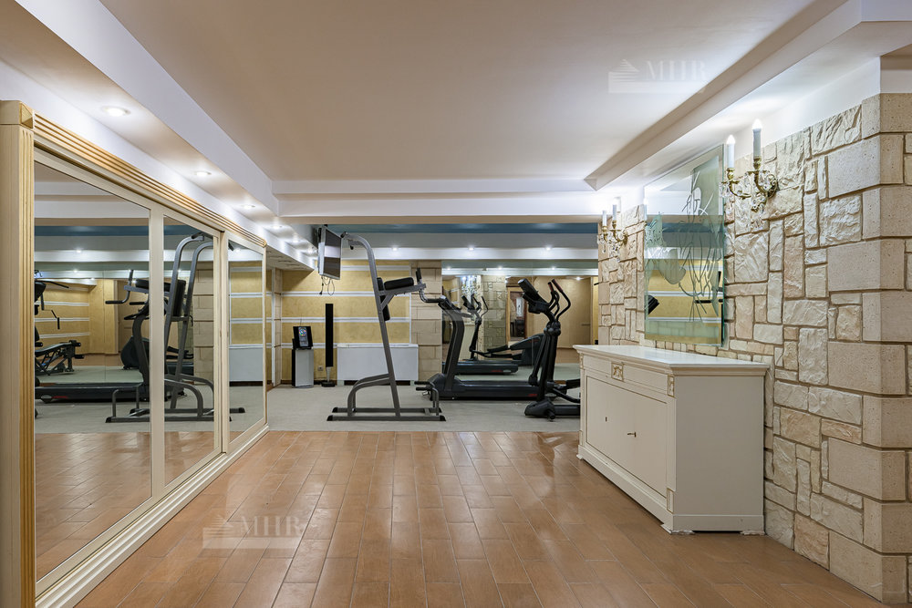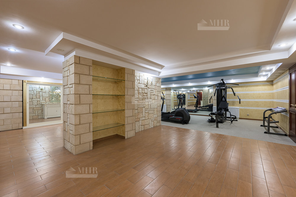 На третьем уровне расположилась библиотека, которая может служить прекрасным местом для уединения и отдыха. В цокольном этаже расположились помещения для комфортного досуга: спортивный зал, винная комната, кинозал. На участке помимо основного дома расположено отдельное здание - дом для персонала с дополнительным гаражным местом, а для летнего отдыха на территории обустроена беседка-барбекю.