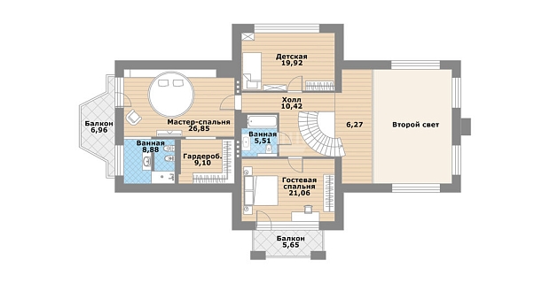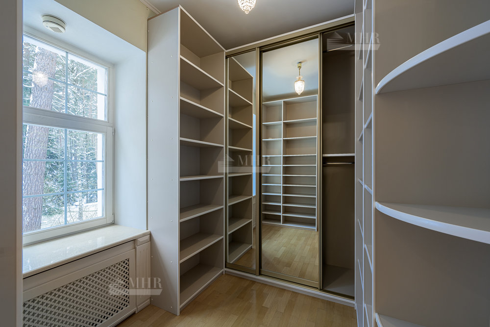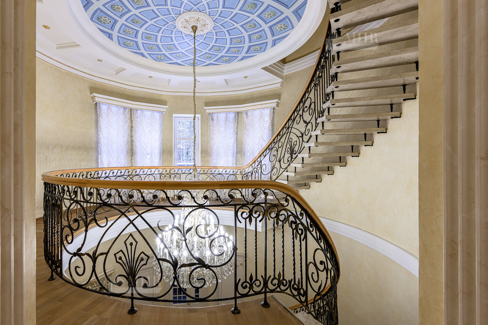 Спальная зона расположена на втором этаже, где находятся два полноценных спальных блока со своими санузлами и гардеробными, а так же мастер-блок состоящий из хозяйской спальня, двух полноценных гардеробных, ванной комнаты и кабинет с камином. Помимо спален здесь находится прекрасное помещение, которое может выполнять функции музыкального зала, детской игровой, дополнительной спальни и из которого есть выход на просторную террасу-патио.