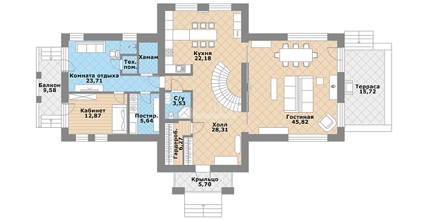 Цоколь: спортивный зал, кладовая/шубная, с/у, постирочная с кладовой, гостиная-кинозал, винный погреб с дегустационной, котельная;