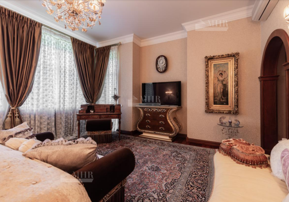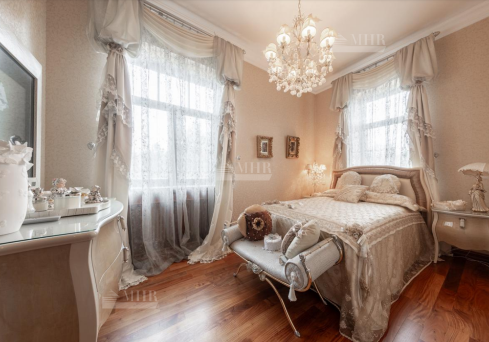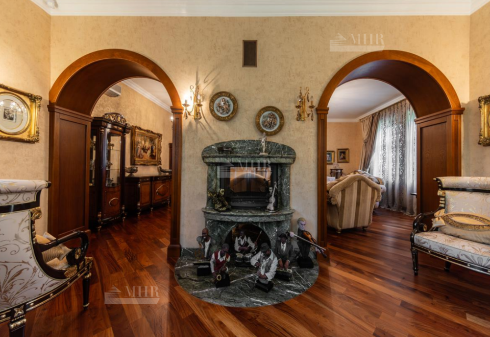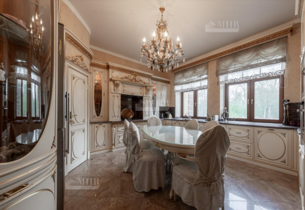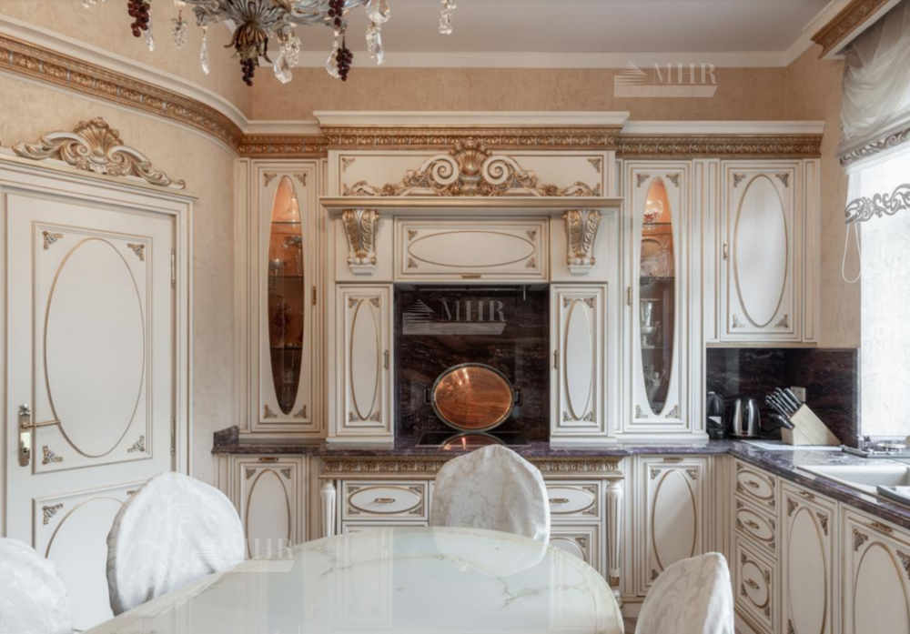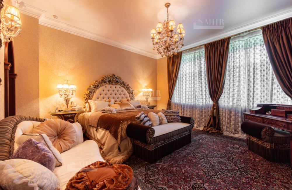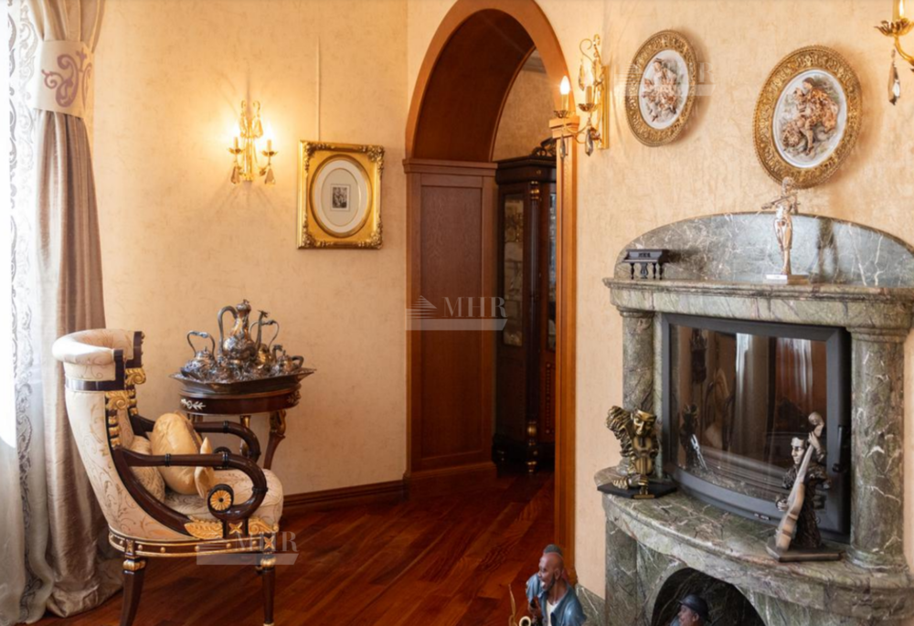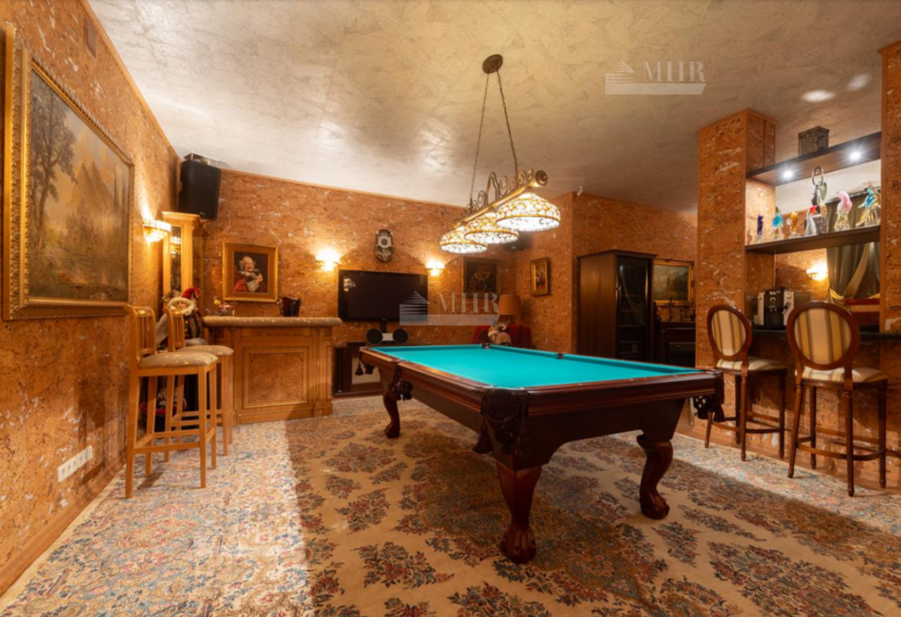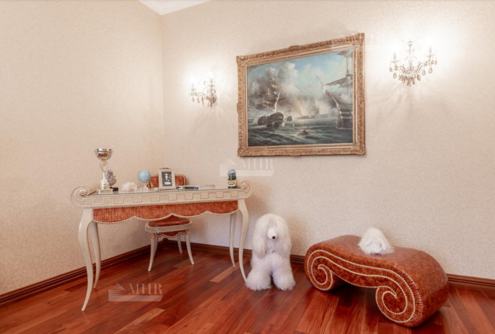 Резиденция находится в идеальном состоянии и украшена редкими антикварными вещами, в частности, из коллекции Фаберже и именными картинами. На цокольном этаже размещены, спортивный зал, кинотеатр, зона отдыха с бильярдной, баром и сигарной, санузел, комната для помощника с санузлом, гардеробом и спальней, кладовая, котельная, чаша бассейна. На первом этаже находятся холл, гардеробная, кабинет, гостиная с камином и выходом на террасу, столовая, санузел, зона SPA с душевой, раздевалкой, сауной, бассейном длиной 12 метров, хаммамом. Второй этаж включает хозяйский блок, гостевой блок и две спальни.