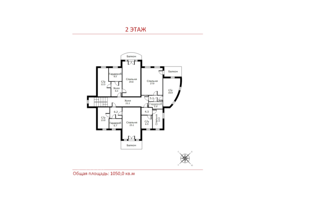2 этаж: спальням балконом, с/у, гардеробной, спальня с гардеробной и с/у, хозяйский блок: спальня, ванная комната, с/у, балкон, гостевой блок: спальня, с/у, гардероб.