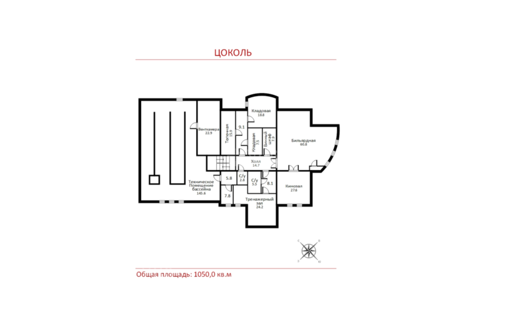 Цоколь: котельная, чаша бассейна, спортивный зал, щитовая, с/у, комната для помощника: с/у, гардероб, спальня, кладовая, кинотеатр, зона отдыха: бильярдная, бар, сигарная;