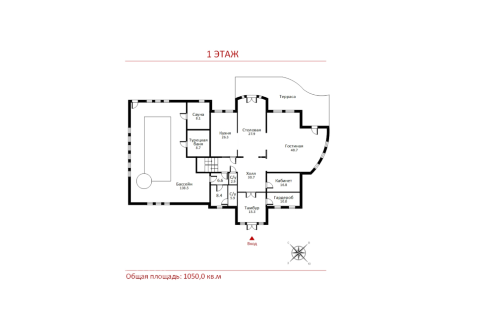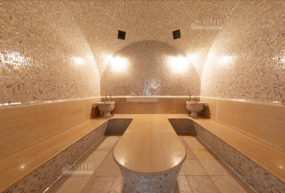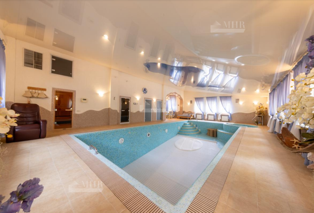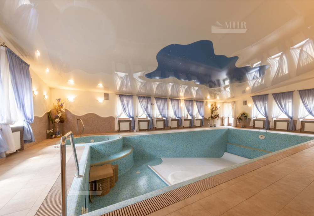 1 этаж: холл, гардеробная, кабинет, гостиный зал с камином и выходом на террасу, столовая с выходом на террасу, с/у, зона спа: с/у, душевая, раздевалка, сауна, бассейн 12 м, хаммам, с/у, душевая;