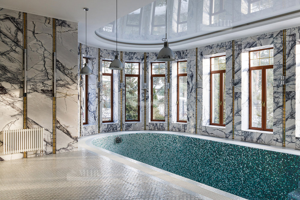 1 этаж: холл, гардеробная, с/у, лифт, каминный зал, кухня-столовая с выходом во двор,зона spa: бассейн 9м. С выходом во двор, хамам, гардеробная, душевая, с/у, лифт;