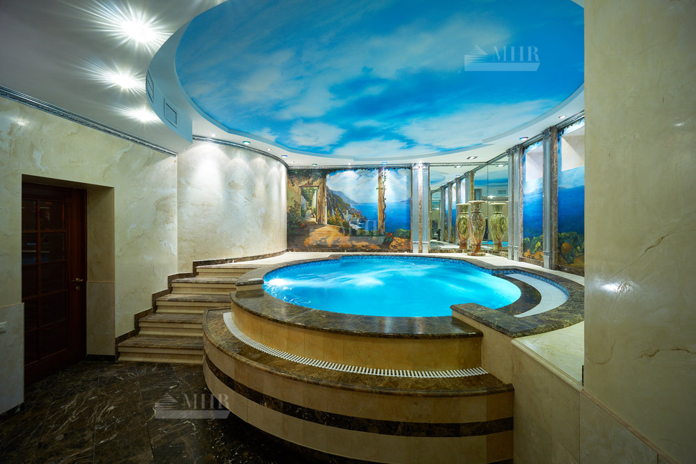 Цоколь: бассейн с гидромассажем, сауна, с/у, постирочная, блок для персонала с отдельным входом: спальня, кухня, с/у, котельная.