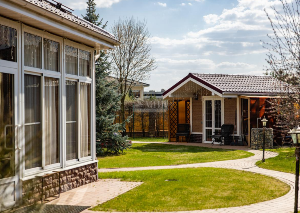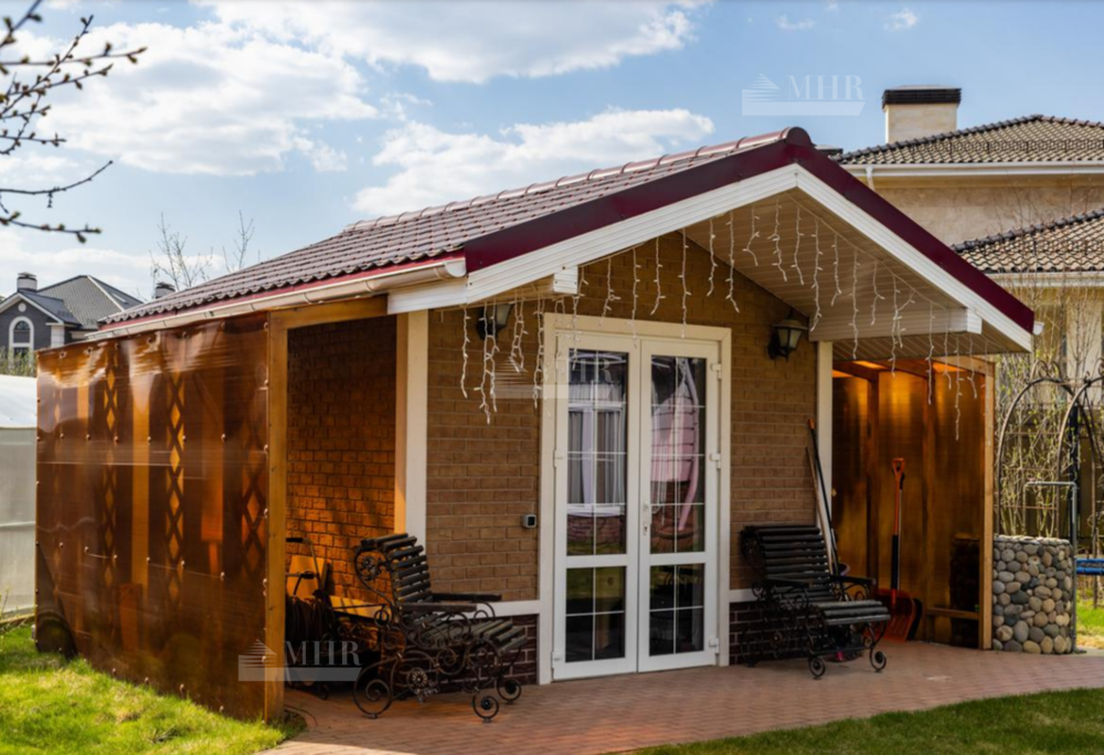 На участке летнее барбекю, домик для персонала, парковка на 2 м/м, оборудованная детская площадка.