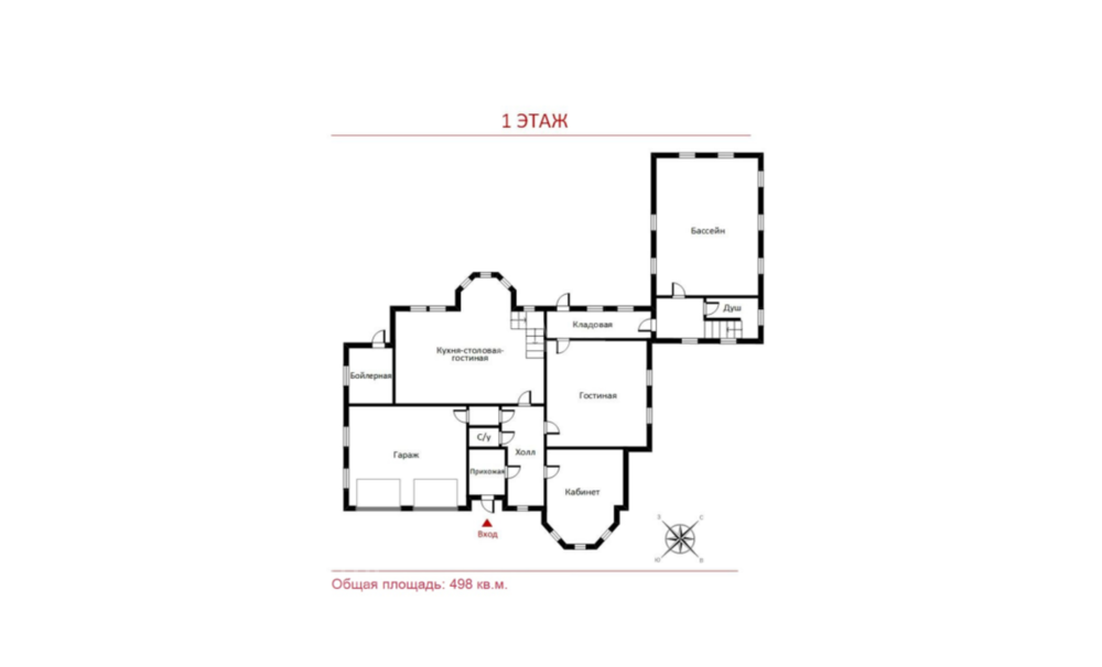 1 этаж: прихожая, гардеробная, кабинет, с/у, гостиная (игровая зона), кухня- столовая, бассейн, душевая, постирочная, гараж на 2 м/м;