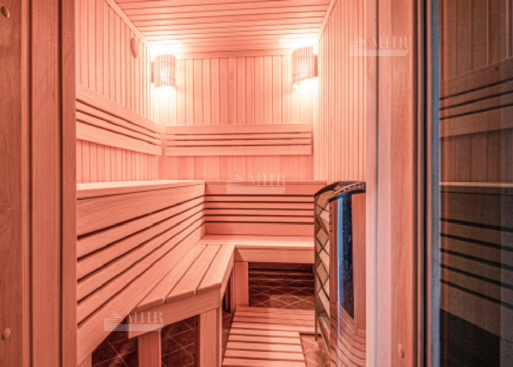 1-й этаж: кухня, гостиная-столовая с камином, кабинет(гостевая спальня),терраса с барбекю, постирочная , сауна, гараж, с/у, блок для персонала;