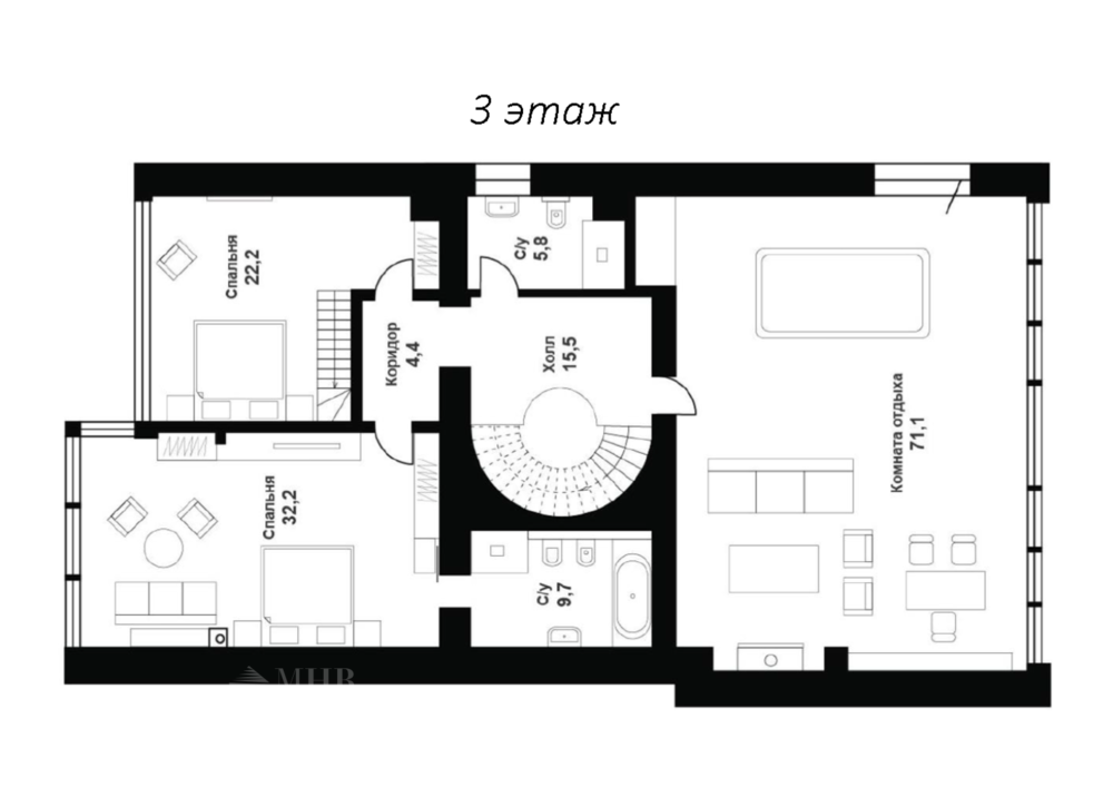 3-й этаж: просторная библиотека, 2 спальни, 2 с/у;