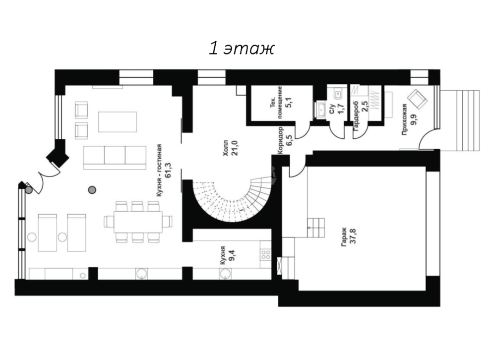 1-й этаж: прихожая, гардеробная, с/у, гостиная-столовая с выходом на террасу и участок, кухня, гараж на 2 м/м, котельная;