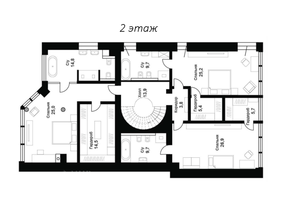 2-й этаж: основная спальня с ванной комнатой и гардеробной, 2 детские спальни, каждая с собственным с/у;