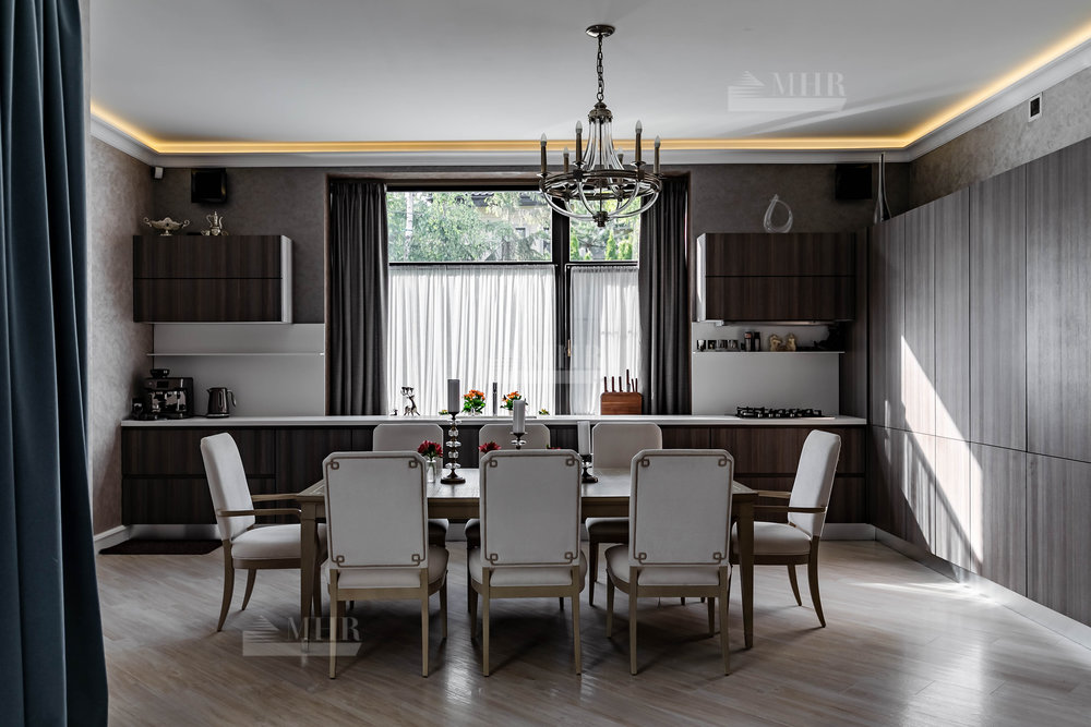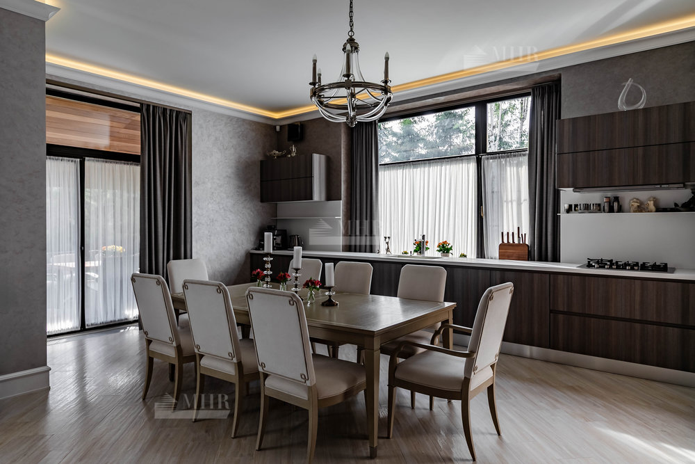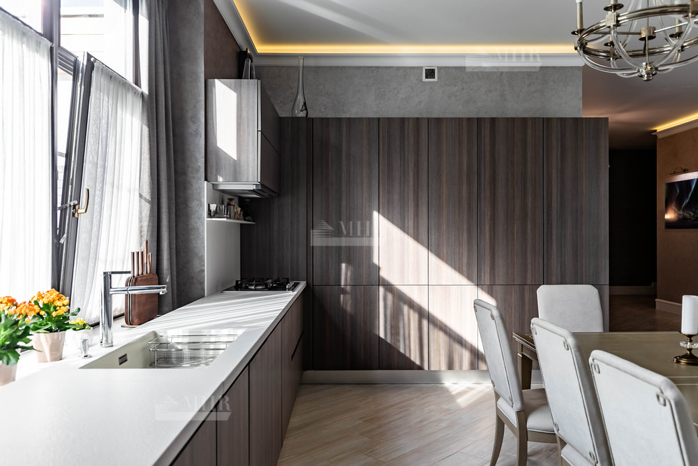 Внутреннее пространство выдержано в неоклассическом стиле, который отличается рациональной сдержанностью и вместе с тем отличается вниманием к деталям.