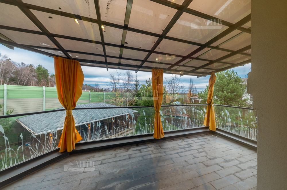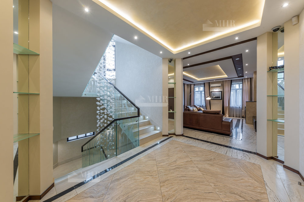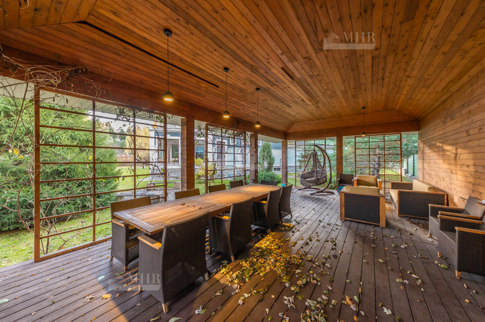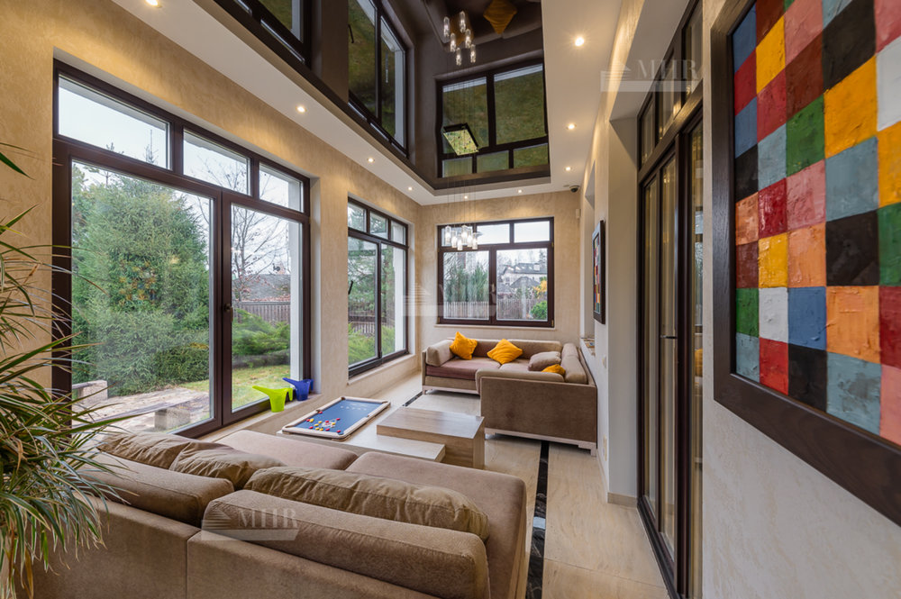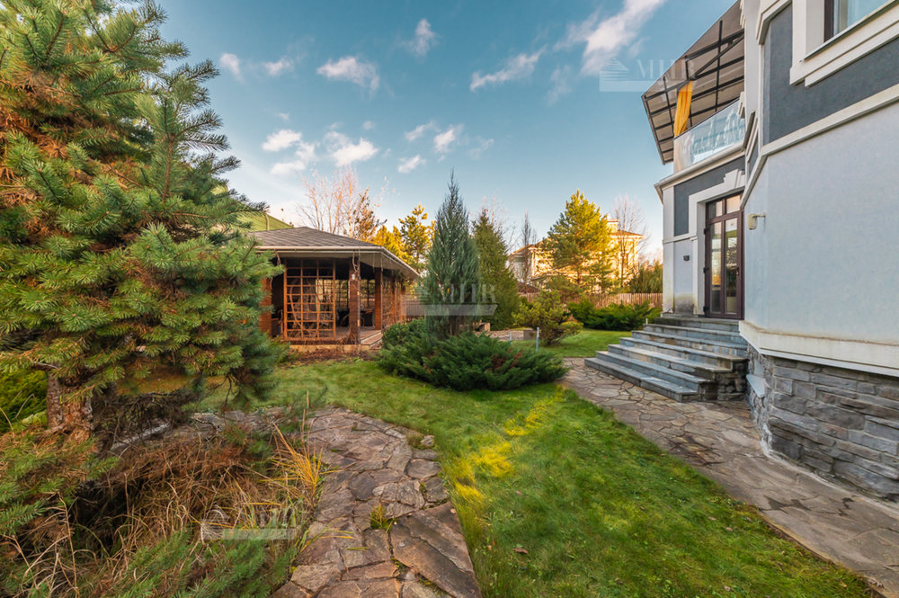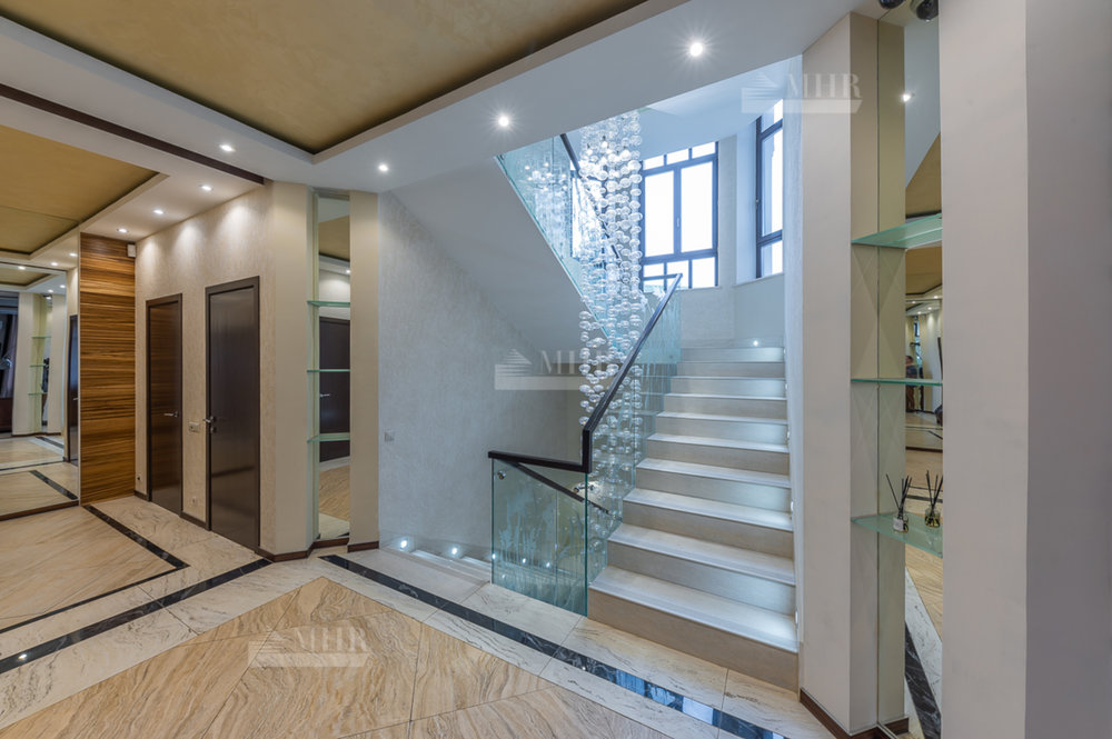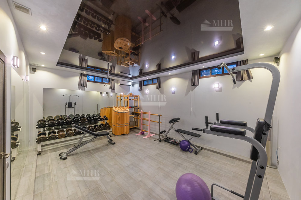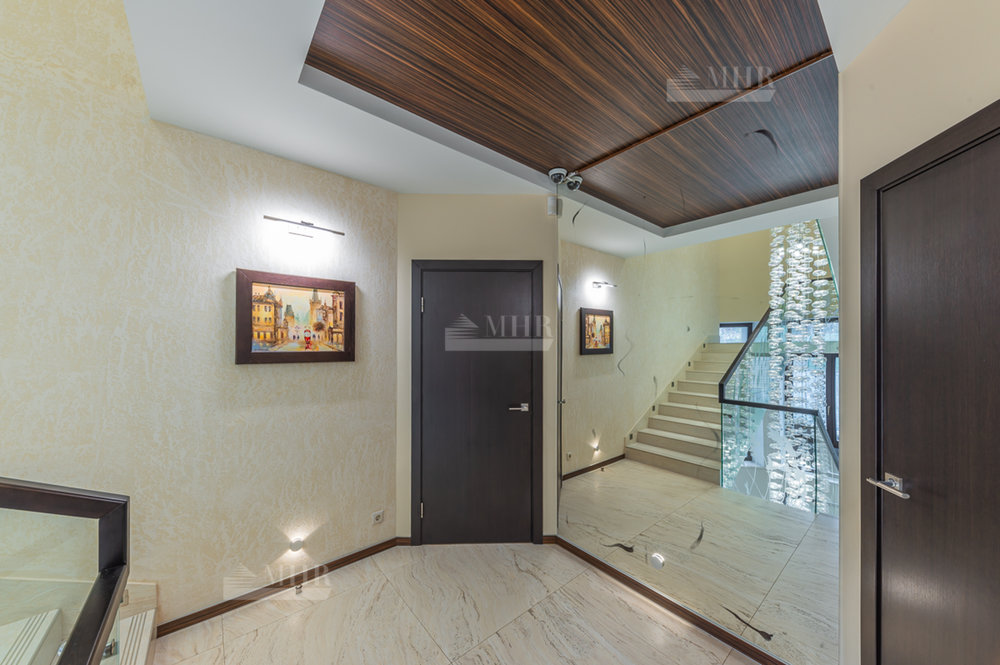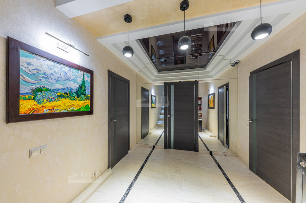 Четырёхуровневый дом в закрытом охраняемом посёлке с хорошей инфраструктурой. Расположен на тупиковой улице, примыкающей к лесу. Полностью меблирован и готов к проживанию. Высокие потолки. Из гостиной выход в зимний сад. Бар и тренажерный зал. Современный ремонт с использованием натуральных материалов: мрамор, дерево. Есть помещение для персонала. Охранная сигнализация, система видеонаблюдения. В котельной оборудование Buderus с обвязкой медью.