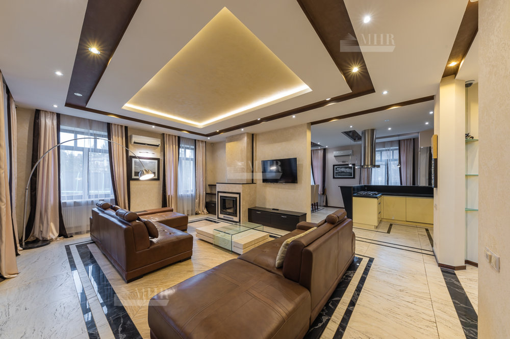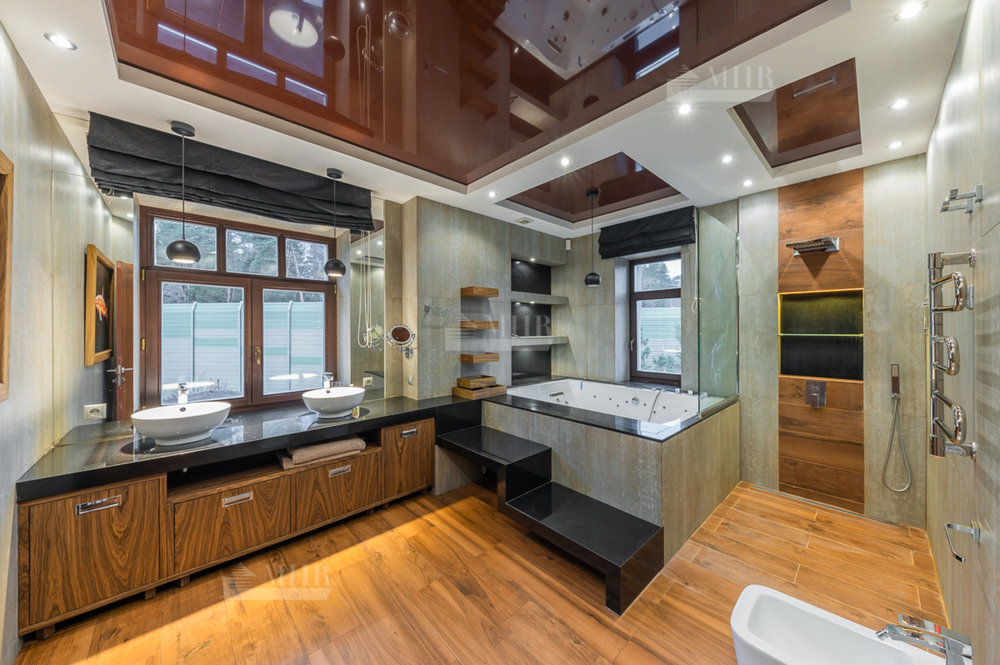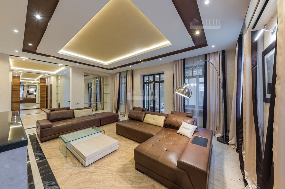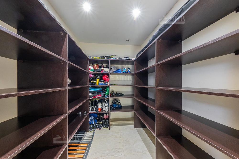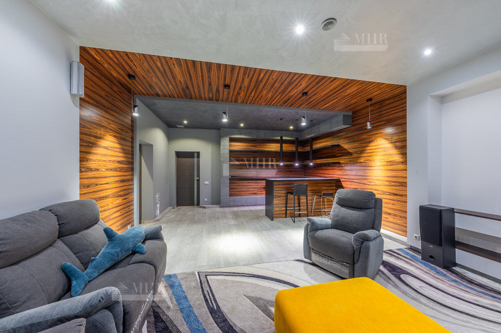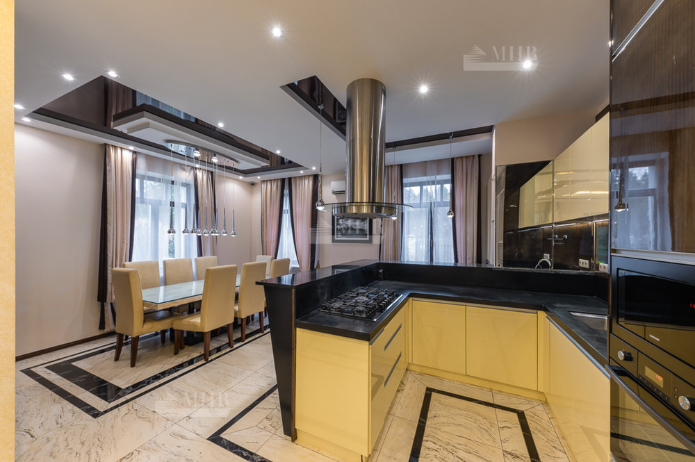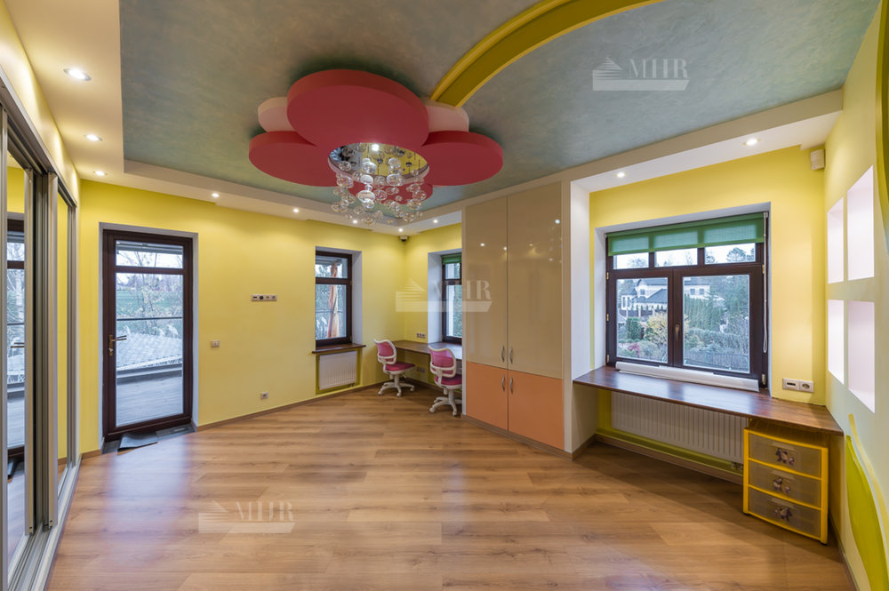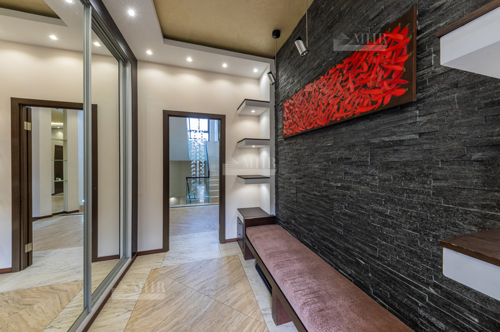 Четырёхуровневый дом в закрытом охраняемом посёлке с хорошей инфраструктурой. Расположен на тупиковой улице, примыкающей к лесу. Полностью меблирован и готов к проживанию. Высокие потолки. Из гостиной выход в зимний сад. Бар и тренажерный зал. Современный ремонт с использованием натуральных материалов: мрамор, дерево. Есть помещение для персонала. Охранная сигнализация, система видеонаблюдения. В котельной оборудование Buderus с обвязкой медью.