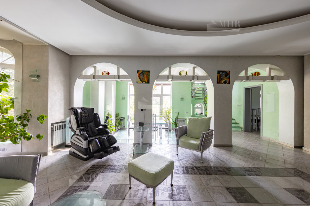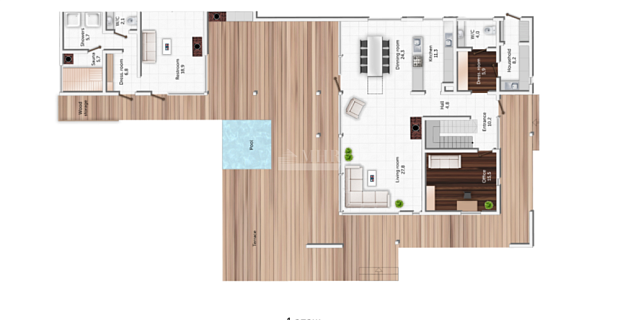1-й этаж: холл-прихожая, с/у, кабинет, гостиная, столовая с выходом на террасу, кухня, отдельная зона для персонала.