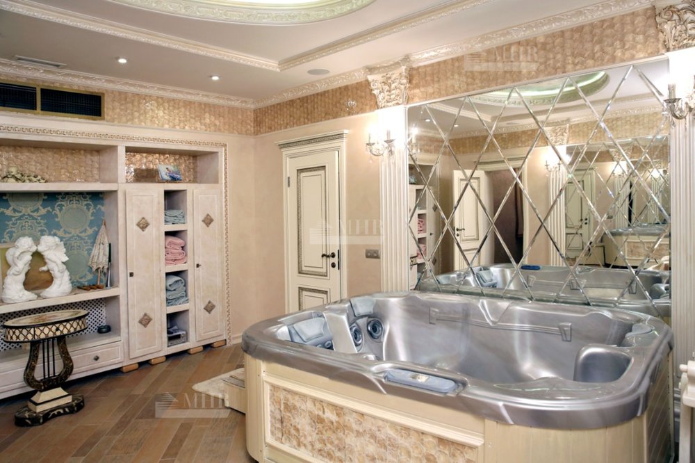 + СПА центр: джакузи, сауна из кедра, массажная, душевая комната и санузел из оникса, бассейн (18 х 6 м + 3,5 м глубина!), русская баня, хамам, купель, тренажерный зал, раздевалки, 2 санузла и 4 душевых