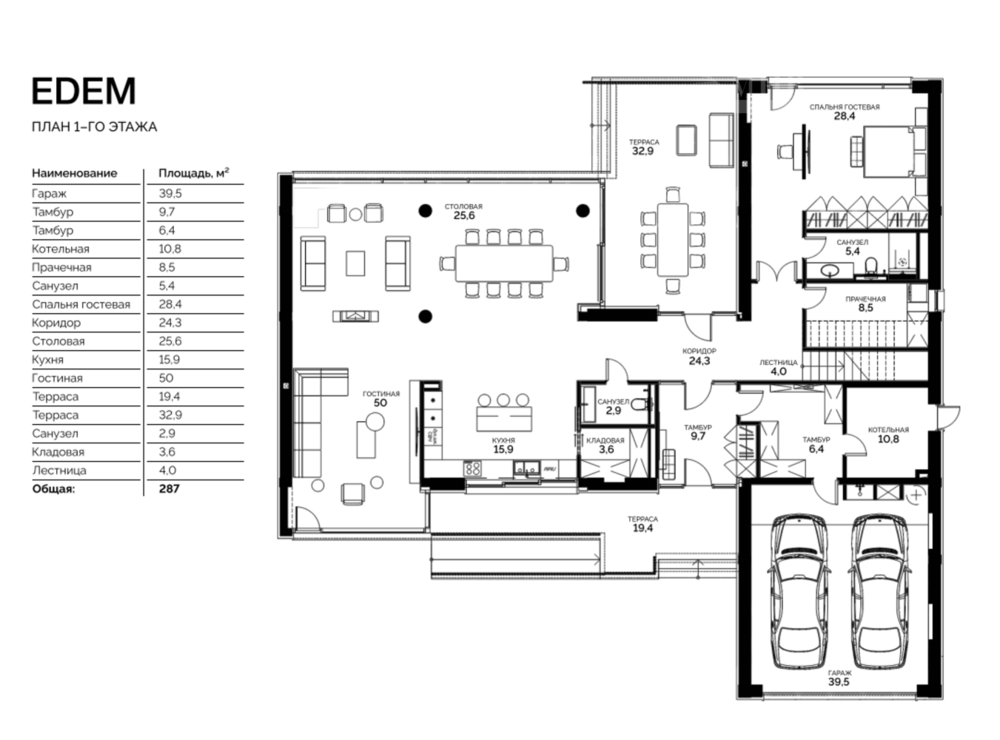 1 этаж: гараж на 2 м/м, котельная, прачечная, 2 с/у, гостевая спальня, столовая, гостиная, терраса, кладовая;
