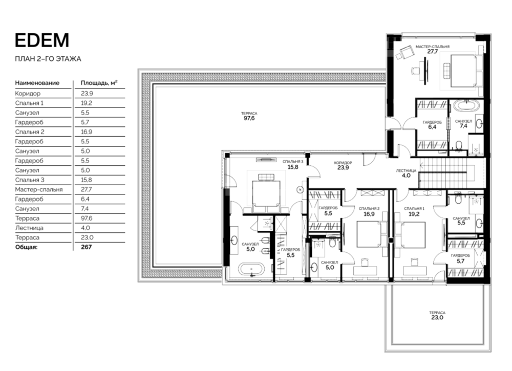 2 этаж: 3 спальни с с/у и гардеробными комнатами, мастер-спальня, 2 террасы.