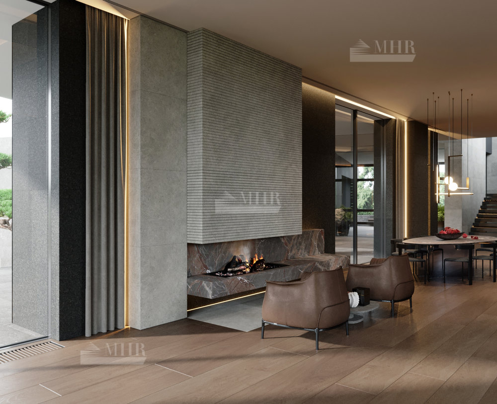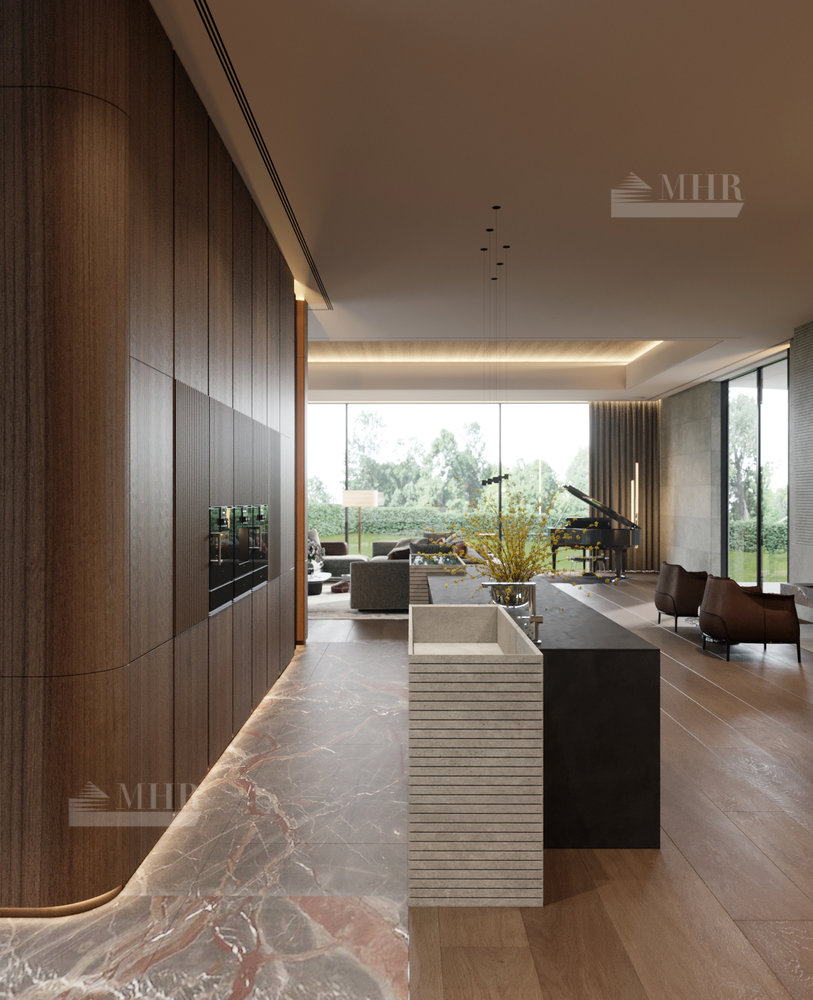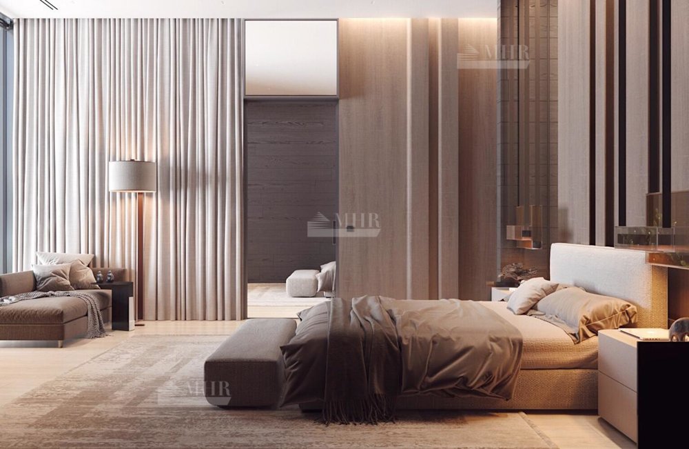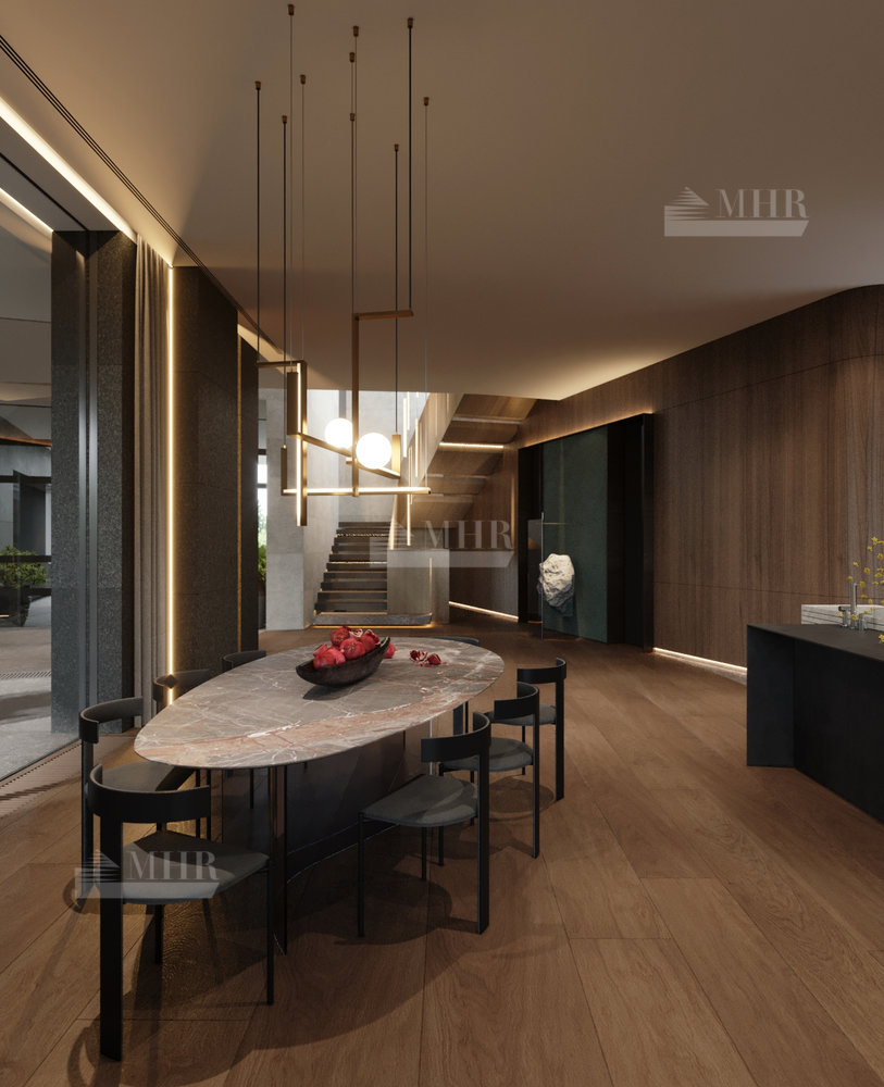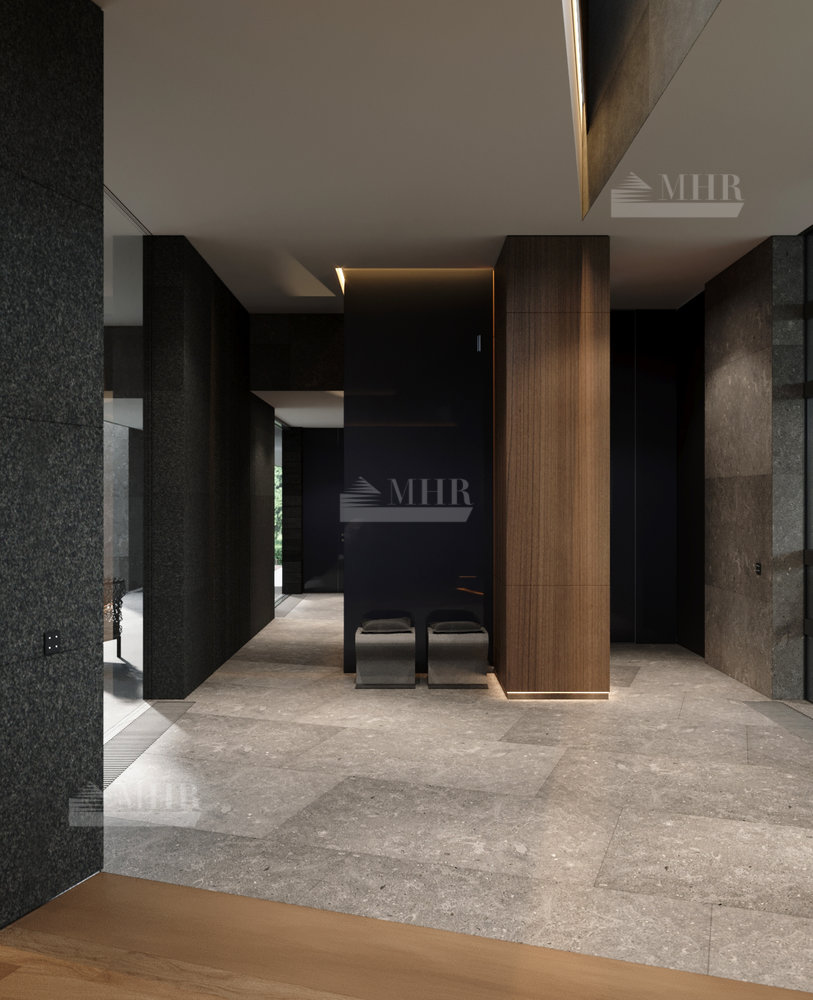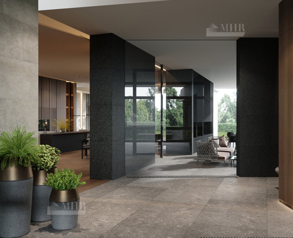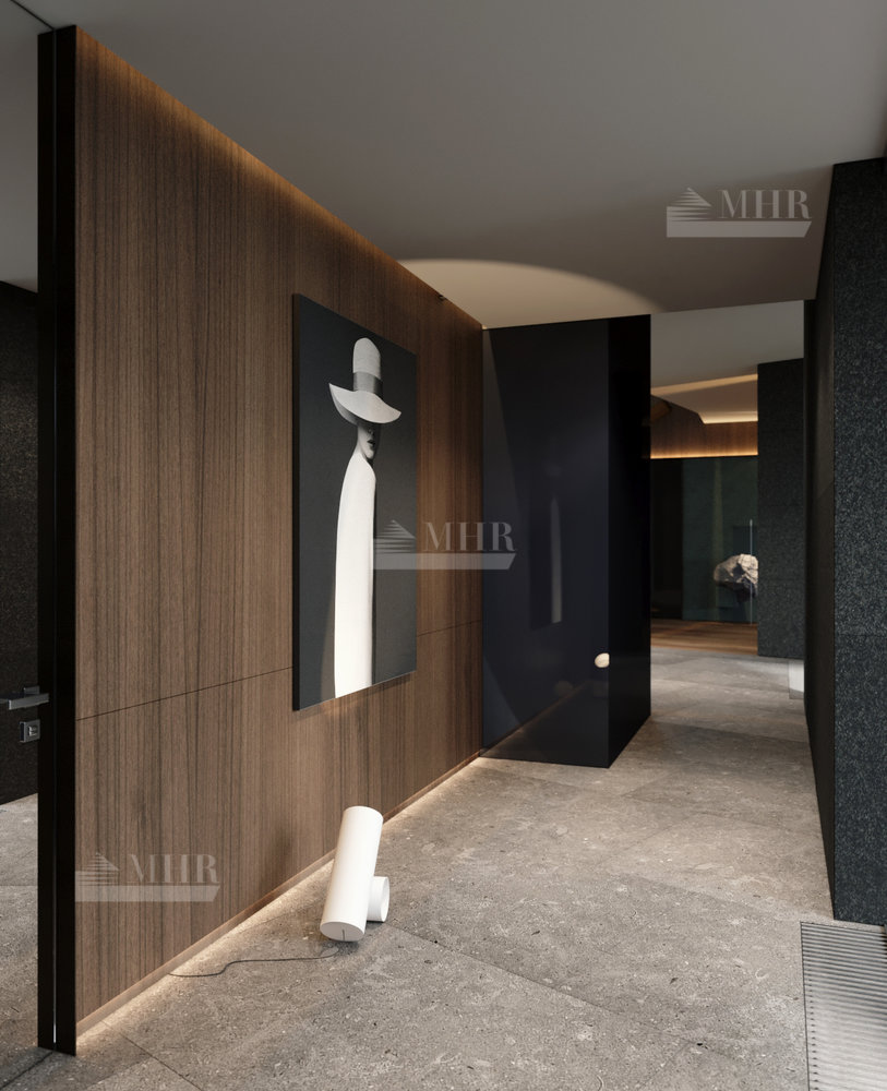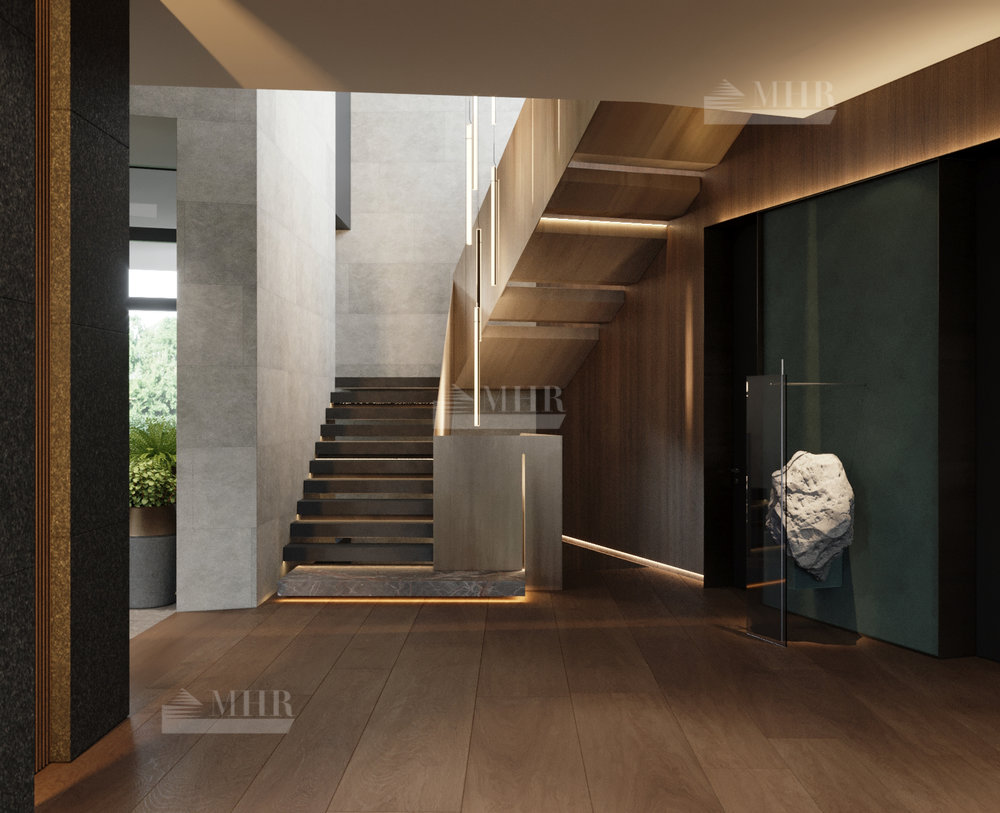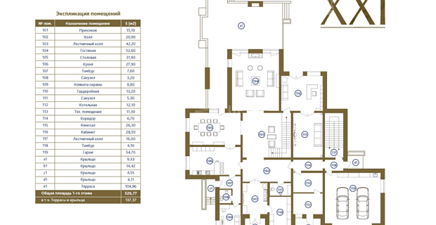 Резиденция представляет собой двухэтажный дом L-образной формы площадью 1917 м², обрамленный с солнечной стороны современными комфортабельными террасами. Площадь первого этажа составляет 760 м², второго — 400 м², окружающих террас — 249 м². Планировочное решение здания выполнено по классической схеме: первый этаж отведенпод общественные пространства, второй — под приватные. Также резиденция располагает подземным уровнем площадью 756 м², включающим в себя просторный зал свободного назначения и технические помещения.