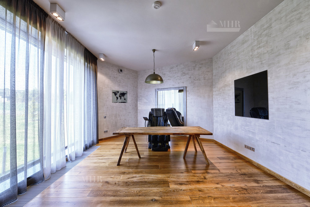 1-й этаж: прихожая, гардеробная, 3 комнаты свободной планировки, спортзал, сауна, душевая, кухня, столовая, просторная гостиная с камином, 2 с/у