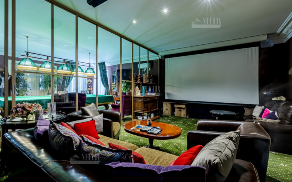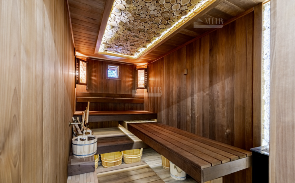 1-й этаж: холл, малая гостиная, гостиная-столовая, кухня, спальня с с/у и гардеробной, кинотеатр, бильярдная комната, кабинет, гостевой с/у, СПА-зона( бассейн, сауна, массажный кабинет, с/у с душевой), крытая терраса-зимний сад, открытая терраса с барбекю, гараж на 4 авто, постирочная, кладовая, котельная;