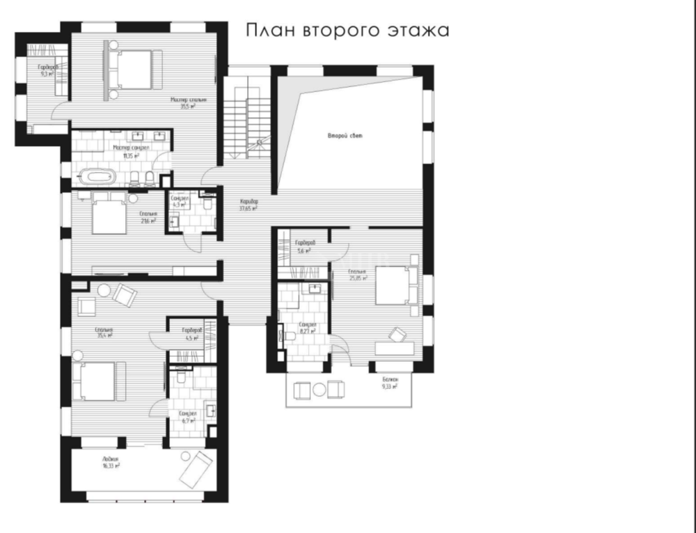 2 этаж: 3 спальни со своими гардеробными и с/у, 1 мастер-спальня.