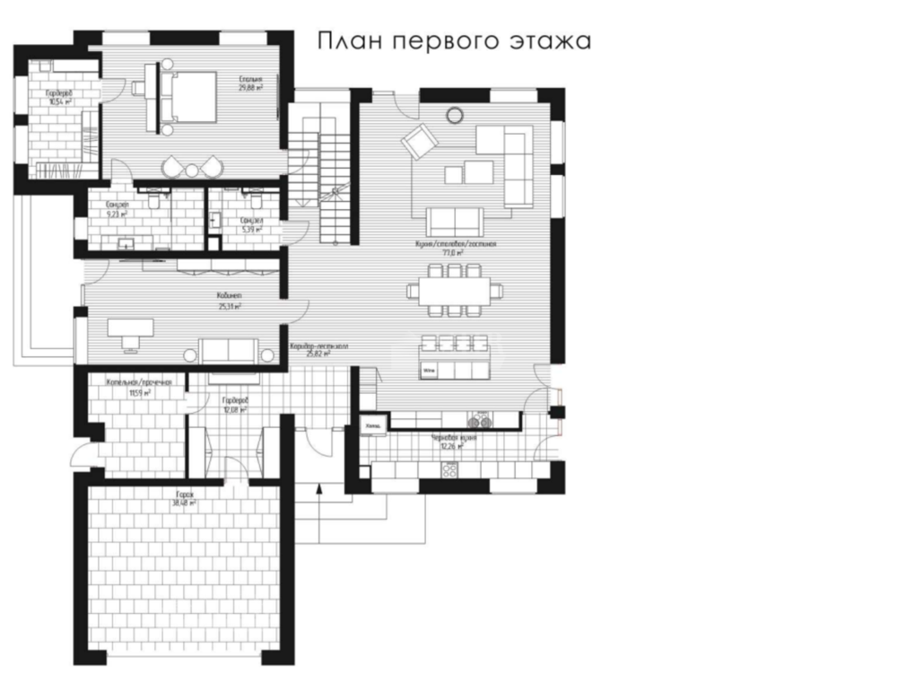 1 этаж: коридор-холл, гардеробная, котельная, черновая кухня, кухня-столовая-госттиная, кабинет, 2 с/у, спальня, гардероб;
