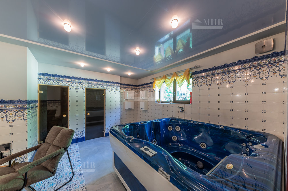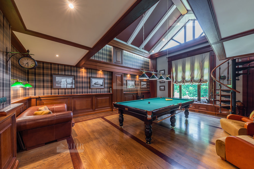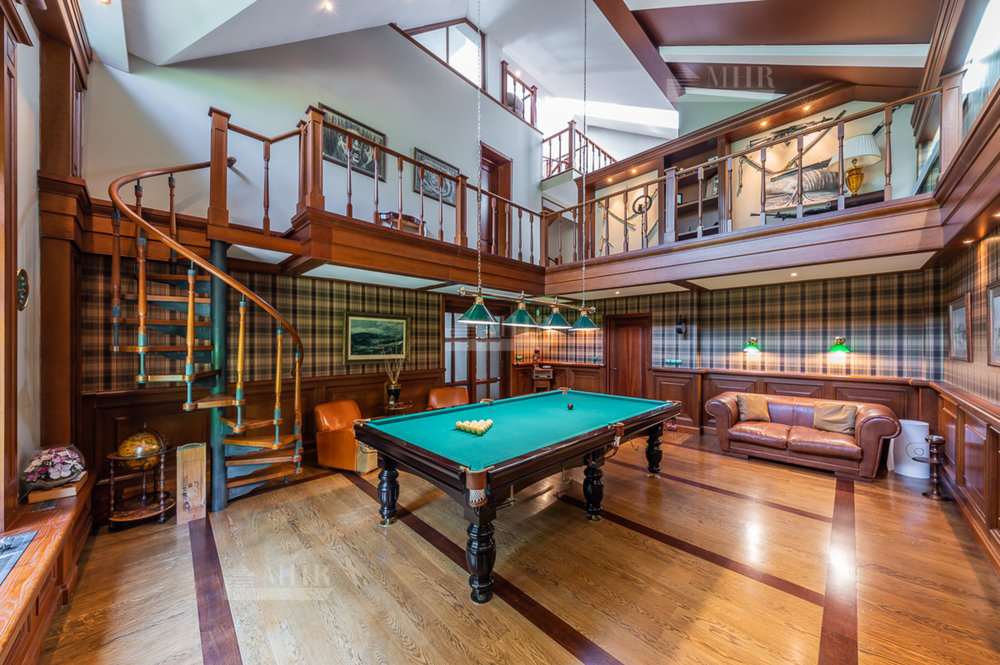 1 этаж: прихожая, гардеробная, гостиная, кухня-столовая, зимний сад с выходом на веранду, бильярдная, с/у,  зона спа( сауна, джакузи), котельная.