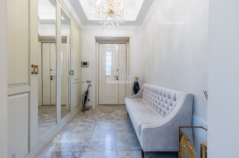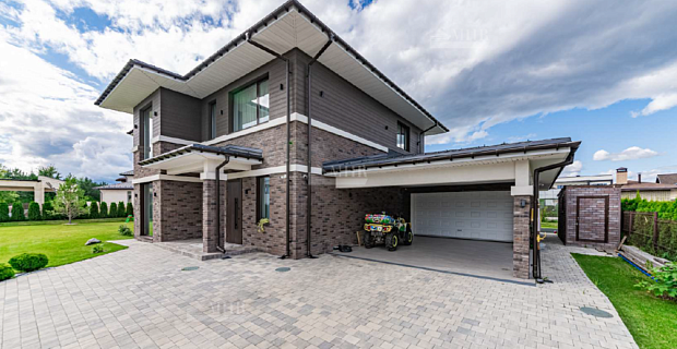 Планировка включает 4 спальни, гостиную с камином, кухню, столовую, кабинет, блок для персонала и террасу. В контуре дома предусмотрен гараж на 2 машины. На участке выполнен ландшафтный дизайн, оборудована система автополива, высажены хвойные и плодовые деревья, цветущие растения.