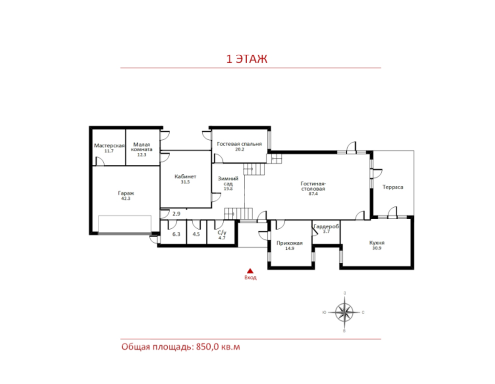 1 этаж: большая гардеробная, гостиный зал со вторым светом и выходом на веранду, кухня с выходом на веранду;