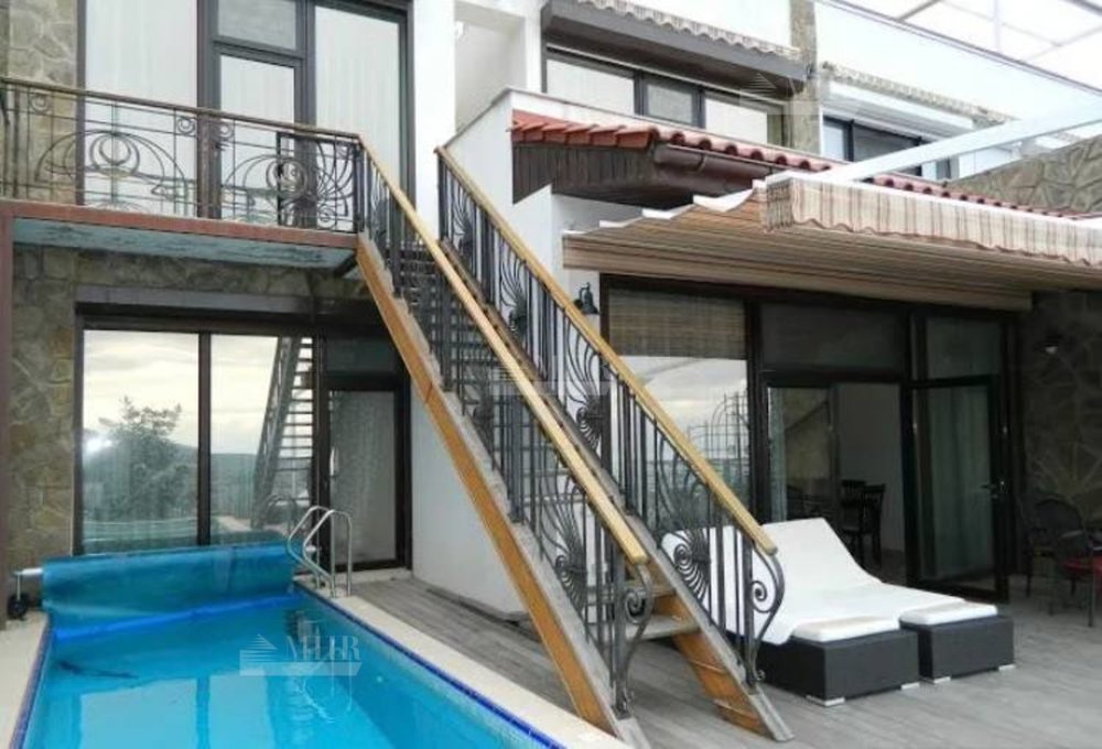 Продается уютный 3-х этажный таунхаус в элитном коттеджном поселке "Вилла Роз". Этот роскошный объект предлагает множество удобств, включая собственный бассейн и сауну. Вы сможете наслаждаться панорамным видом на величественные горы, море и живописный Гурзуф. Идеальное предложение для тех, кто ищет комфорт и спокойствие в сочетании с роскошным образом жизни.                                                                                                                                                                                                 На 1 этаже : сауна,котельная,гараж,совмещенный санузел,спальня для гостей.                                                                                                                                                                      2 этаж: Кухня-гостиная с выходом к бассейну, видовая терраса,совмещенный санузел.                                                                                                                                                      3 этаж: Детская комната с тремя кроватями, 2 спальни, санузел, балкон с шикарным видом, выход на эксплуатируемую кровлю.