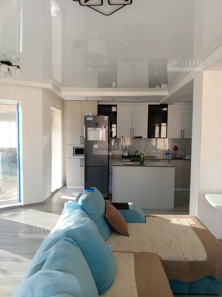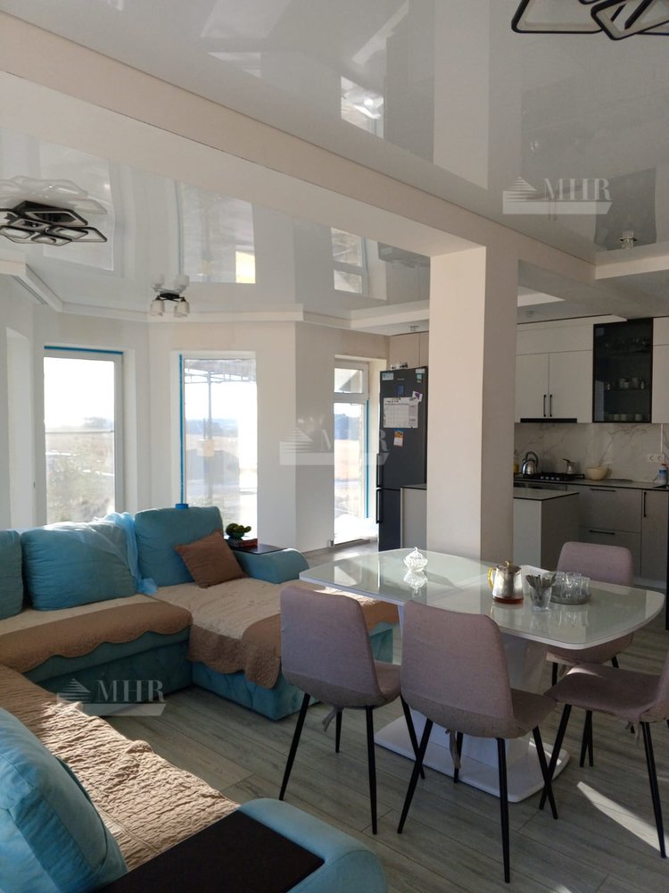 Выполнен качественный ремонт из дорогих материалов, кухня по индивидуальному проекту ,прихожая, гардеробная,кухня- гостиная, три спальни ,совмещённый санузел. Стены из инкерманского камня ,утеплены фасадными термопанелями.Фундамент ленточный. Панорамные стеклопакеты.Кровля из металлопрофиля , утеплённая минватой. Высота потолков 3м. Отопление- газовый котел,водяной тёплый пол.Водоснабжение- городское.Канализация - септик( выгребная яма) 12 м.куб.. Электричество 15кВт, 3 фазы. В доме 3 отдельные спальни для большой семьи или расположения гостей. Есть парковка на 2-3 автомобиля.