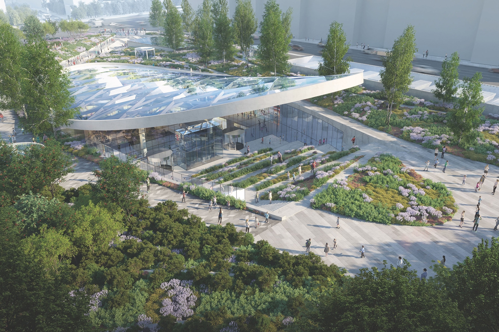 Новый проект от бюро Апекс предполагает 75% озеленения в уровне площади, подземную площадь около 70 000 м2, пять подземных уровней: первый, как говорится в сообщении МКА, будет связан с существующим подземным переходом через Садовое кольцо, которое здесь называется Зацепский вал, на втором и третьем запланированы магазины и кафе, как на Манежной, на четвертом парковка на 270 машиномест, в пятом хранилища и холодильные установки. Все вместе называется ТРЦ «Павелецкая площадь». Узнаваемая особенность проекта – глубокий стеклянный козырек над пологим входом под землю, он немного похож на открытый рот лягушки.
